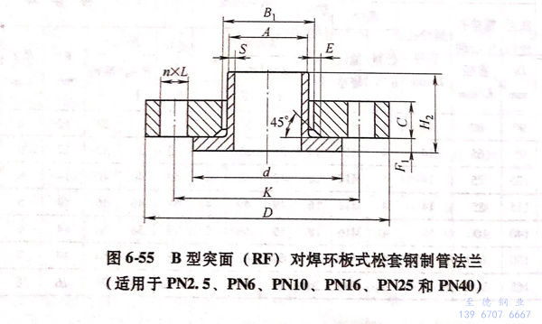 2. 用PN標(biao)記的B型對焊環板(ban)式松套鋼制管法(fa)蘭的型式如(ru)圖6-55所示(shi);法(fa)蘭密封(feng)面(mian)尺寸(cun)見(jian)表6-113;法(fa)蘭結構尺寸(cun)或尺寸(cun)見(jian)表6-118~表6-123,當(dang)用戶選用的S值不同(tong)于表中數值時,應在訂貨時注明。