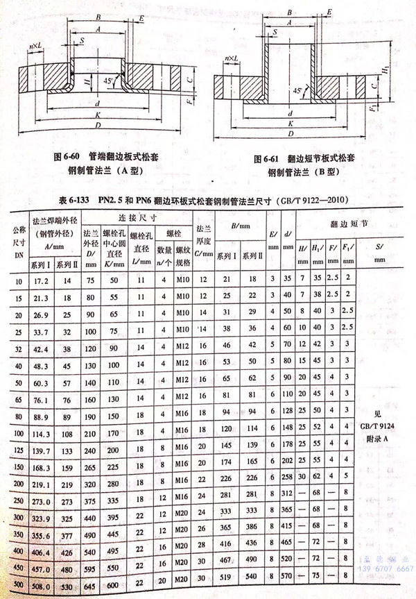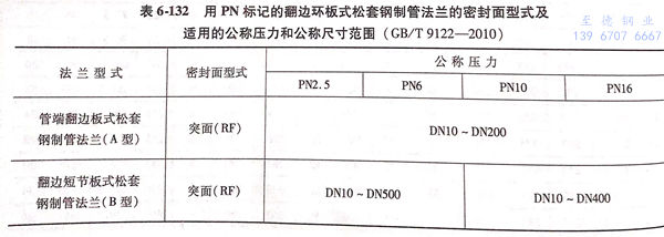 翻邊(bian)環板(ban)(ban)式松(song)套(tao)法(fa)(fa)蘭(lan)包括用(yong)PN標(biao)記(ji)的(de)(de)管(guan)端翻邊(bian)板(ban)(ban)式松(song)套(tao)鋼(gang)制管(guan)法(fa)(fa)蘭(lan)(A型)和(he)翻邊(bian)短(duan)節板(ban)(ban)式松(song)套(tao)鋼(gang)制管(guan)法(fa)(fa)蘭(lan)(B型)兩類(lei),其(qi)密封面型式及適用(yong)的(de)(de)公稱(cheng)壓力(li)和(he)公稱(cheng)尺(chi)寸(cun)范圍見表(biao)6-132;用(yong)PN標(biao)記(ji)的(de)(de)翻邊(bian)環板(ban)(ban)式松(song)套(tao)鋼(gang)制管(guan)法(fa)(fa)蘭(lan)的(de)(de)型式如圖6-60~圖6-61所示(shi),法(fa)(fa)蘭(lan)結構(gou)尺(chi)寸(cun)或尺(chi)寸(cun)見表(biao)6-133~表(biao)6-135。