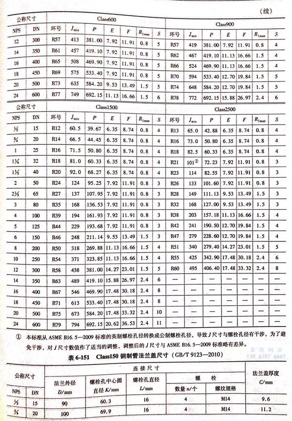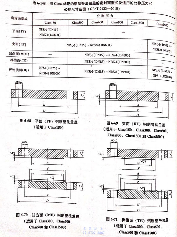用(yong)Class標記的(de)鋼(gang)制管(guan)法(fa)蘭(lan)蓋的(de)密封面型式及適(shi)用(yong)的(de)公稱壓(ya)力和(he)公稱尺(chi)寸范圍(wei)見表(biao)(biao)(biao)6-148;用(yong)Class 標記的(de)鋼(gang)制管(guan)法(fa)蘭(lan)蓋的(de)型式如(ru)圖6-68~圖6-72所示,密封面尺(chi)寸見表(biao)(biao)(biao)6-149~表(biao)(biao)(biao)6-150,法(fa)蘭(lan)結構尺(chi)寸見表(biao)(biao)(biao)6-151~表(biao)(biao)(biao)6-156。