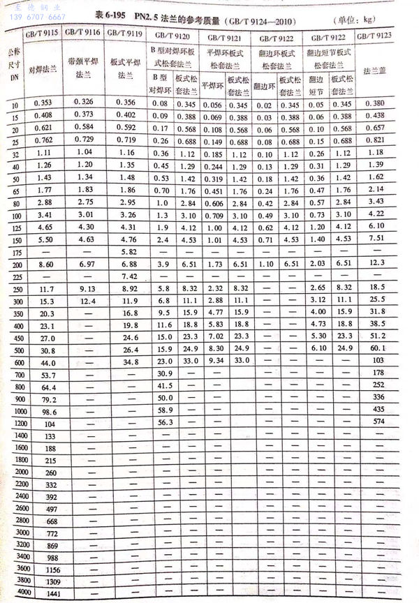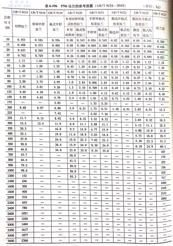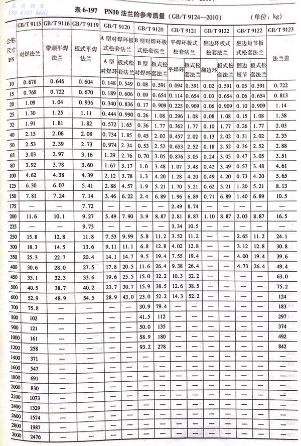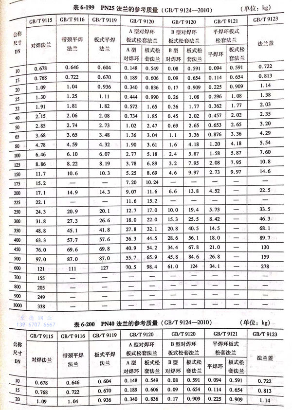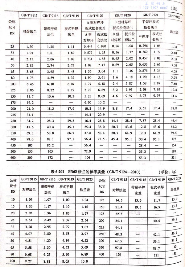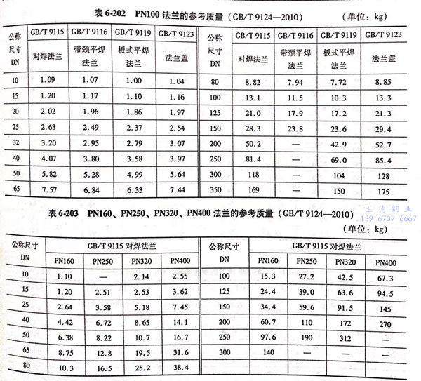 用PN標記的法蘭(包括PN2.5~PN400共12個壓力級的法蘭)的參考質量見(jian)表6-195~表6-203。