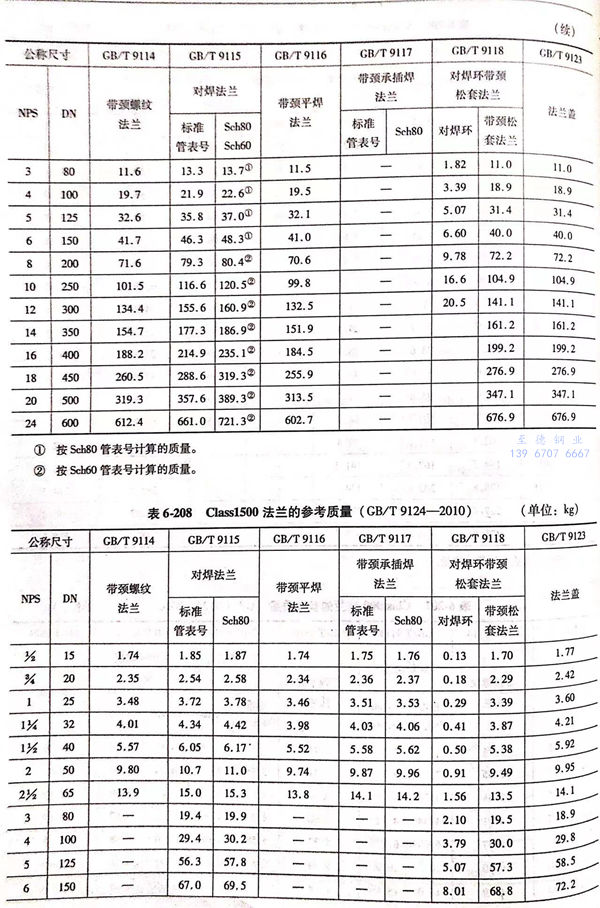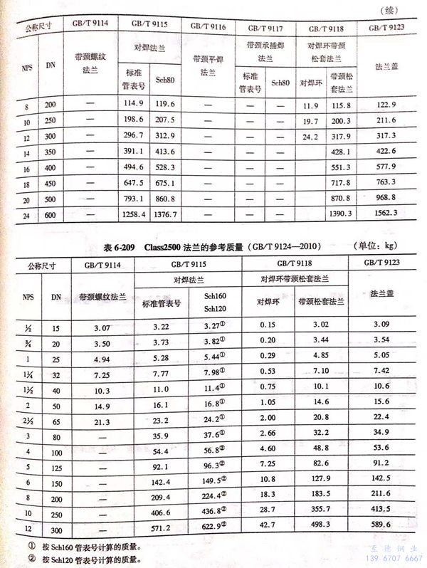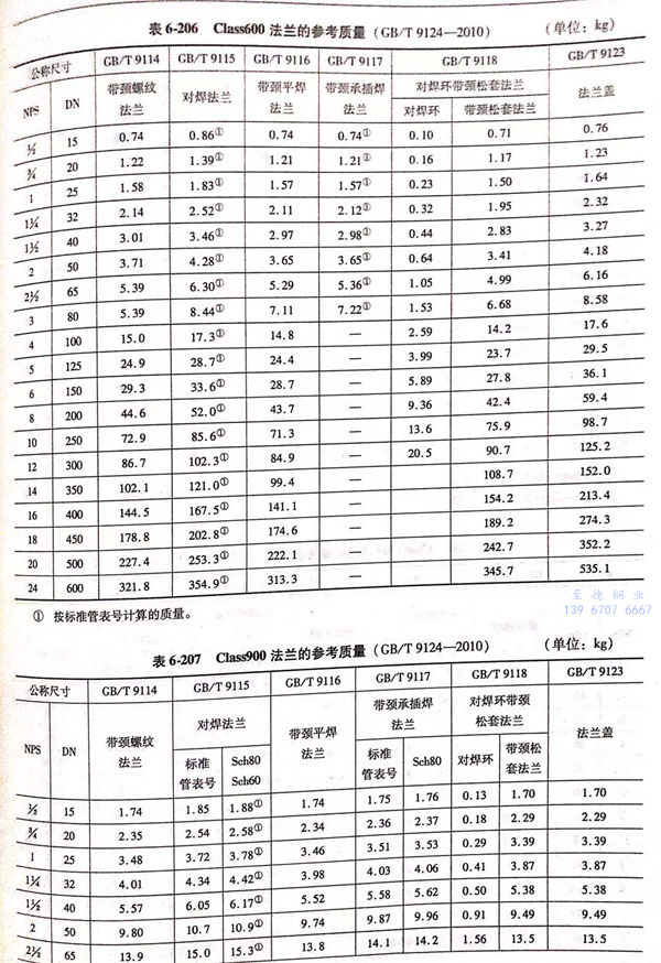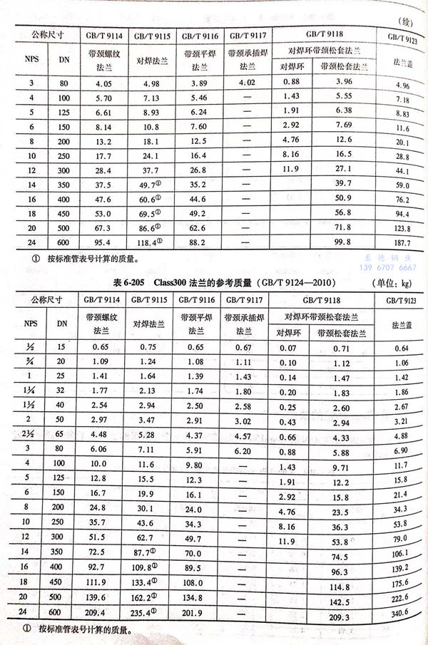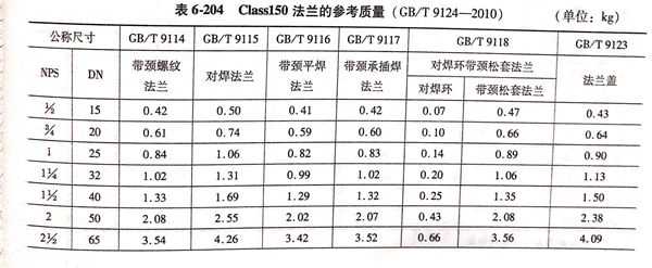 用(yong) Class 標記的(de)(de)法蘭(lan)(lan)(包括 Class 150 ~ Class 2500 共6個壓(ya)力級的(de)(de)法蘭(lan)(lan))的(de)(de)參考質量見(jian)表6-204~表6-209。