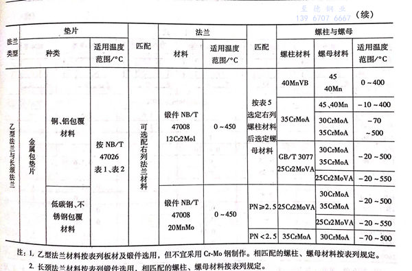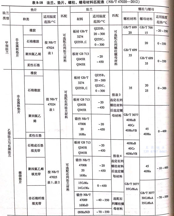甲型平(ping)焊法(fa)蘭(lan)(lan)、乙型平(ping)焊法(fa)蘭(lan)(lan)和長頸對焊法(fa)蘭(lan)(lan)(以下簡稱甲型、乙型、長頸法(fa)蘭(lan)(lan))與墊片、螺柱與螺母材料的匹(pi)配(pei)(含適用溫(wen)度范圍)見表8-18。
