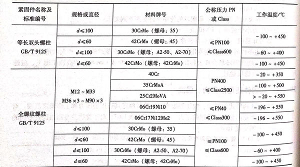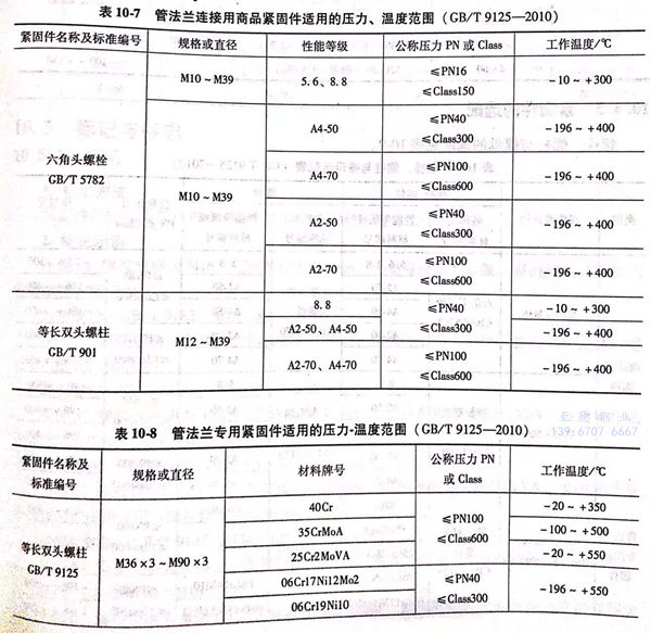 根據緊固(gu)件的(de)型(xing)式與尺寸、性能(neng)等級(ji)或(huo)材料牌(pai)號確(que)定(ding)其適用(yong)的(de)壓(ya)力和工作溫度范(fan)(fan)圍(wei)。對(dui)于管法蘭(lan)連(lian)接用(yong)商品緊固(gu)件適用(yong)的(de)壓(ya)力、溫度范(fan)(fan)圍(wei)見表10-7;對(dui)于管法蘭(lan)專用(yong)緊固(gu)件適用(yong)的(de)壓(ya)力、溫度范(fan)(fan)圍(wei)見表10-8.