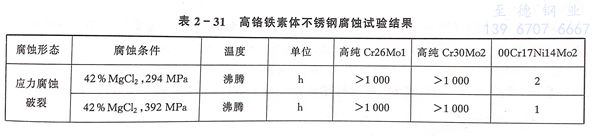 高純Cr30Mo2、008Cr30Mo2、447J1不銹鋼在氯化物溶液中具有極好的耐應力腐蝕性,如表2-31、圖2-38所示,在42%沸騰MgCl2中,即使承受高應力也不產生破裂。