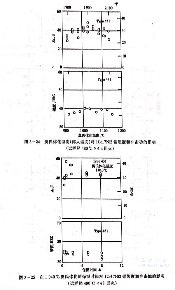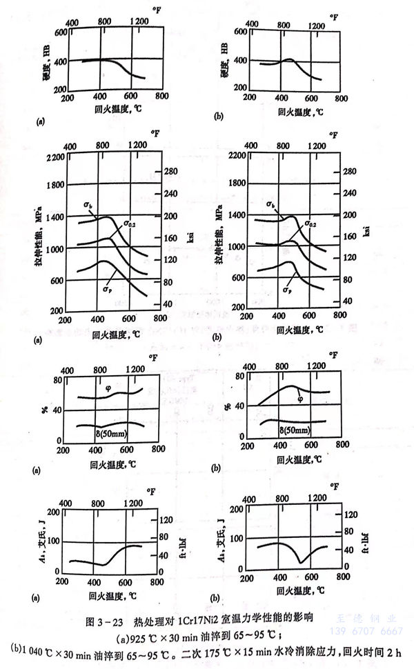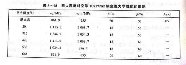 1Cr17Ni2、14Cr17Ni2、431 不銹鋼的室溫力(li)學性(xing)能可通過熱處(chu)理工藝予以(yi)調(diao)整(zheng),熱處(chu)理工藝條件與室溫力(li)學性(xing)能的影(ying)響見表3-78和圖(tu)3-23至圖(tu)3-25。