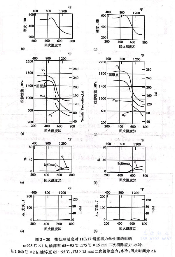 7Cr17、68Cr17、440A不(bu)銹(xiu)鋼(gang)(gang)、8Cr17、85Cr17、440B不(bu)銹(xiu)鋼(gang)(gang)、11Cr17、108Cr17、440C不(bu)銹(xiu)鋼(gang)(gang)的(de)高(gao)溫(wen)力(li)學性能見(jian)圖3-21。在482℃回火,保(bao)溫(wen)時間(jian)和軟化效(xiao)果見(jian)圖3-22。