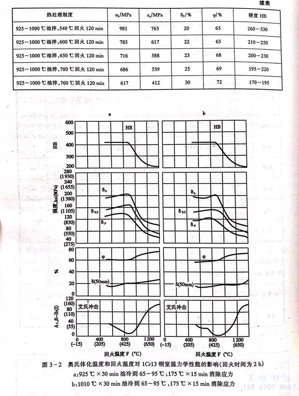 不(bu)同標準對(dui)1Cr13、12Cr13、410不(bu)銹鋼的室溫(wen)力學(xue)性(xing)能(neng)的規定(ding)值(zhi)(zhi)見表(biao)3-2。實測數據見表(biao)3-3。奧(ao)氏體(ti)化溫(wen)度(du)和回火溫(wen)度(du)對(dui)1Cr13、12Cr13、410不(bu)銹鋼室溫(wen)力學(xue)性(xing)能(neng)的影響見圖3-2。熱處理(li)工藝(yi)制度(du)對(dui)不(bu)同溫(wen)度(du)下(1Cr13)410不(bu)銹鋼沖擊值(zhi)(zhi)的影響見表(biao)3-4。