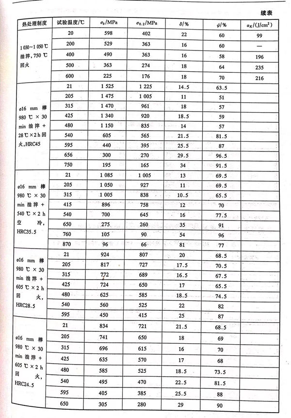 不(bu)同熱處理條件(jian)下的高(gao)溫瞬時(shi)力學性能(neng)見(jian)表3-6。隨(sui)回火(huo)溫度的提高(gao)×強度下降而塑韌性明顯提高(gao),詳見(jian)表3-7。