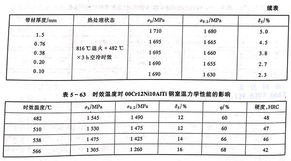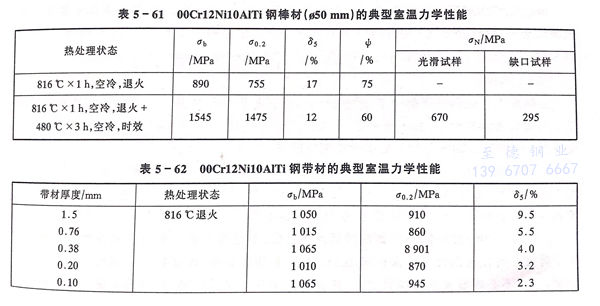 00Cr12Ni10AlTi 不銹(xiu)鋼在退火條件下具有(you)較高(gao)的抗拉強度和屈服強度,且塑性和韌性良好。通過簡單的時效處理,其強度水(shui)平較退火狀(zhuang)態(tai)提高(gao)1倍,同時保留了足夠的塑韌性。00Cr12Ni10AITi 不銹(xiu)鋼棒(bang)材(cai)、帶材(cai)及時效處理對室溫力學性能的影響見(jian)表(biao)(biao)5-61至表(biao)(biao)5-63。