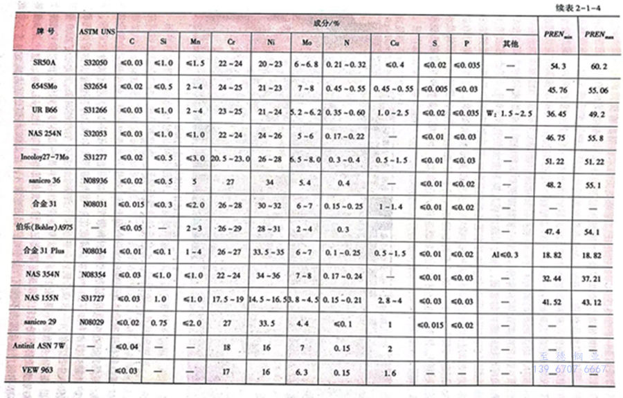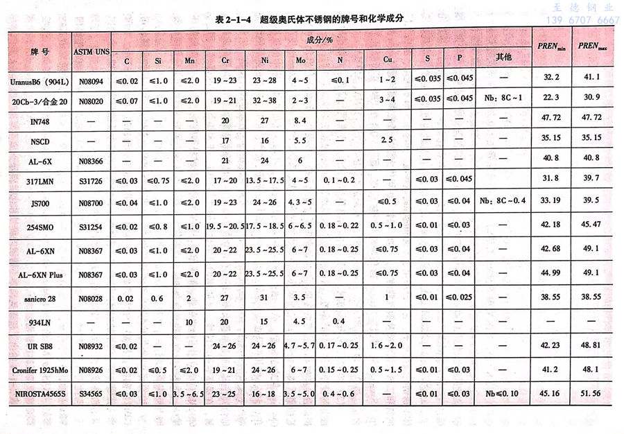 表2-1-4給出(chu)了超級奧(ao)氏體不銹(xiu)鋼的牌號和化學成分。