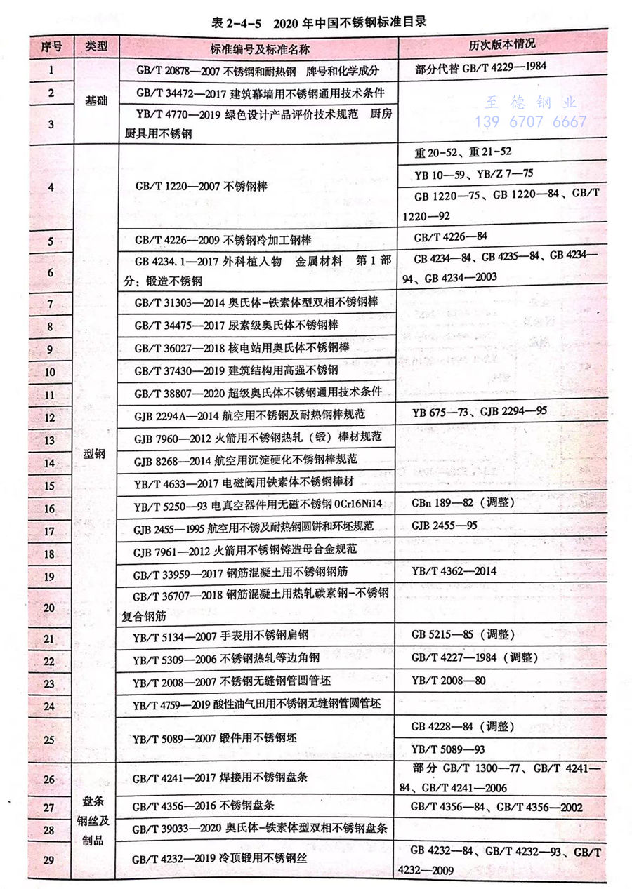 隨著(zhu)我國(guo)(guo)不(bu)(bu)(bu)銹鋼(gang)工(gong)藝(yi)與(yu)裝備(bei)水(shui)平的(de)(de)不(bu)(bu)(bu)斷(duan)突破和(he)進(jin)步,使(shi)(shi)制(zhi)造成(cheng)本大(da)幅(fu)下降,加之人們對不(bu)(bu)(bu)銹鋼(gang)產(chan)品全生(sheng)命周期綜合成(cheng)本的(de)(de)重(zhong)視程(cheng)度(du)(du)不(bu)(bu)(bu)斷(duan)提高(gao)(gao),極大(da)地(di)推動了(le)不(bu)(bu)(bu)銹鋼(gang)在各產(chan)業大(da)量使(shi)(shi)用(yong),進(jin)一步提高(gao)(gao)了(le)不(bu)(bu)(bu)銹鋼(gang)標(biao)準(zhun)制(zhi)修(xiu)訂的(de)(de)速度(du)(du)和(he)數量,從2011年至2020年,我國(guo)(guo)共制(zhi)修(xiu)訂不(bu)(bu)(bu)銹鋼(gang)標(biao)準(zhun)89項(xiang)(xiang),其中新制(zhi)定了(le)核電、汽車、城市軌道車輛(liang)、貨運車輛(liang)、石油(you)、化(hua)工(gong)、船舶、橋梁、電力、環保、建筑(zhu)及航天航空等重(zhong)點領域急需標(biao)準(zhun)63項(xiang)(xiang)(國(guo)(guo)家(jia)標(biao)準(zhun)41項(xiang)(xiang),國(guo)(guo)家(jia)軍用(yong)標(biao)準(zhun)10項(xiang)(xiang),行業標(biao)準(zhun)12項(xiang)(xiang)),不(bu)(bu)(bu)銹鋼(gang)標(biao)準(zhun)總數達到115項(xiang)(xiang)(見表2-4-5)。這些標(biao)準(zhun)的(de)(de)制(zhi)修(xiu)訂與(yu)實(shi)施(shi),極大(da)地(di)推動了(le)鐵(tie)素體型(xing)(xing)、奧氏體-鐵(tie)素體型(xing)(xing)、超級不(bu)(bu)(bu)銹鋼(gang)型(xing)(xing)和(he)高(gao)(gao)強度(du)(du)不(bu)(bu)(bu)銹鋼(gang)等新牌號、新品種(zhong)研發與(yu)應(ying)用(yong)。