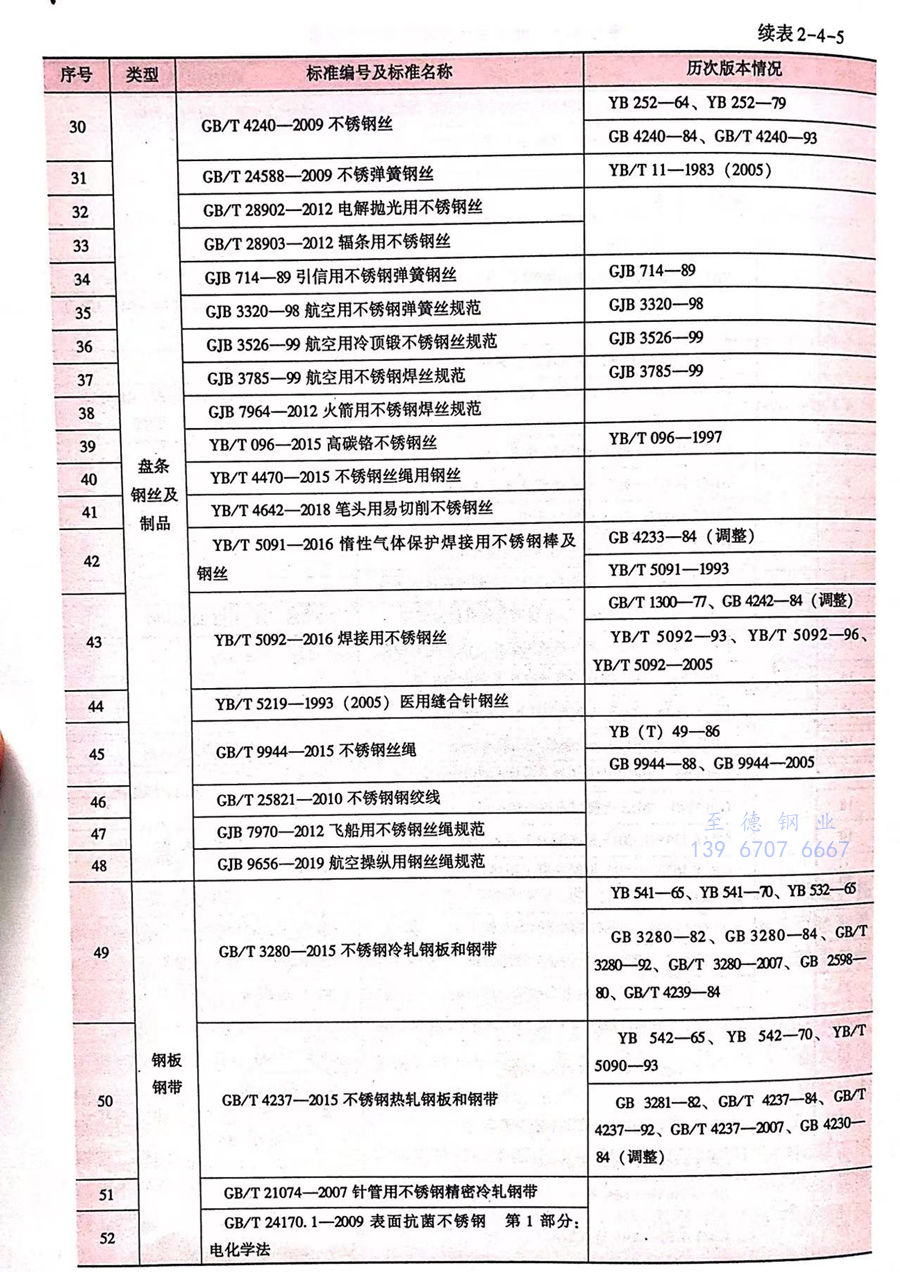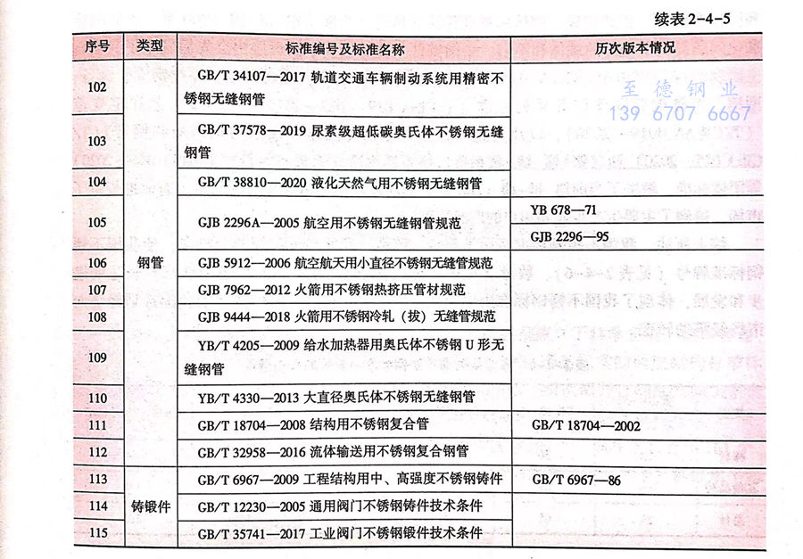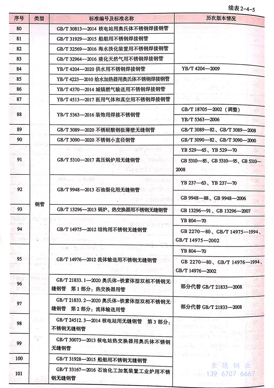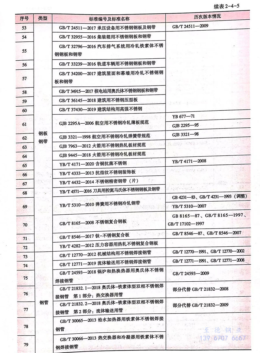 《高壓鍋爐用無縫鋼管》(GB 5310-2008)、《石油裂化用無縫鋼管》(GB 9948-2013)、《承壓設備用不銹鋼鋼板及鋼帶》(GB 24511-2009)、《核電站用無縫鋼管 第3部分:不銹鋼無縫鋼管》(GB 24512.3-2014)、《承壓設備用無縫復合鋼管》(GB 28883-2013)、《核電站用奧氏體不銹鋼焊接(jie)鋼管》(GB 30813-2014)、《核電站用奧氏體不銹鋼棒》(GB/T36027-2018)。同時,還廢止了《磁頭用不銹鋼冷軋鋼帶》(YB/T 085-2007)、《彩色顯像管彈簧用不銹鋼冷軋鋼帶》(YB/T 110-2011)、《手表用不銹鋼冷軋鋼帶》(YB/T 5133-2007)、《S型釬焊不銹鋼金屬軟管》(YB/T 5307-2006)等4項行業標準(見表2-4-5)。