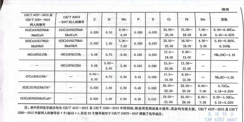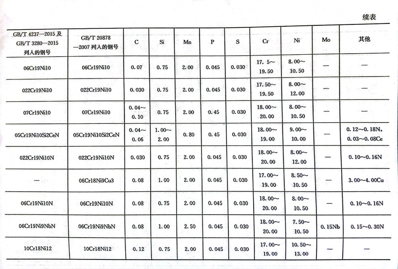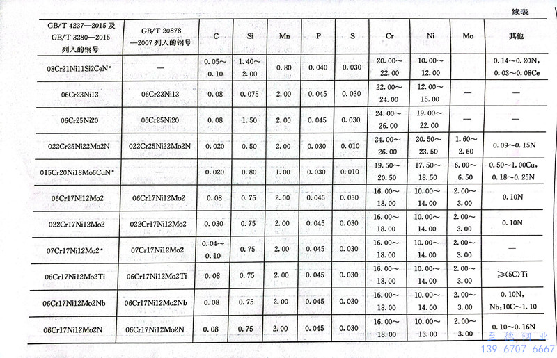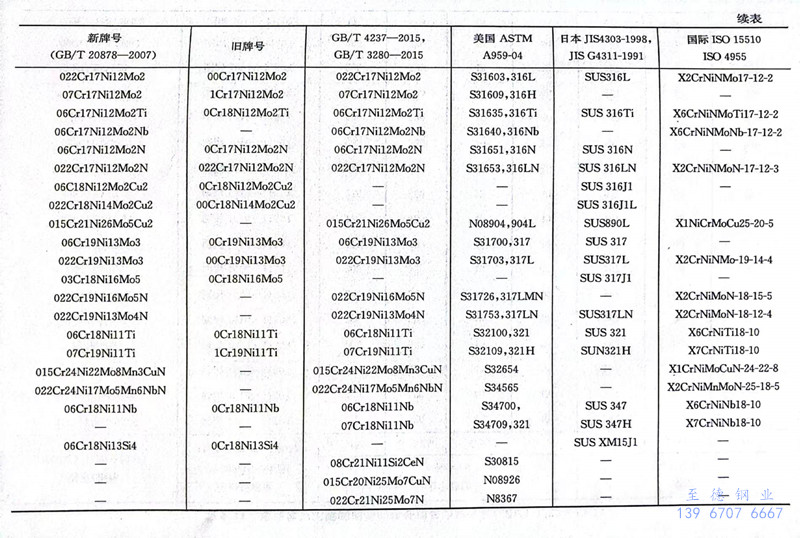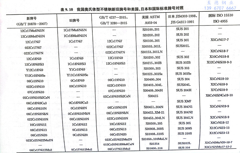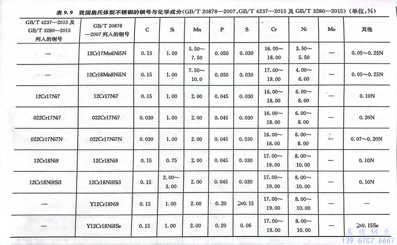 在GB/T 20878-2007中列(lie)入(ru)了42個奧(ao)(ao)氏(shi)體(ti)(ti)型(xing)(xing)不(bu)(bu)銹鋼(gang)的(de)牌號(hao)(hao)。在新修訂的(de)GB/T 4237-2015及GB/T 3280-2015中列(lie)人(ren)的(de)奧(ao)(ao)氏(shi)體(ti)(ti)型(xing)(xing)不(bu)(bu)銹鋼(gang)的(de)牌號(hao)(hao)有39個,有7個是新加(jia)入(ru)的(de),其中5個是GB/T 20878-2007中未(wei)列(lie)入(ru)的(de)。表9.9為(wei)(wei)(wei)GB/T 20878-2007、GB/T 4237-2015及GB/T 3280-2015中列(lie)入(ru)的(de)我國(guo)奧(ao)(ao)氏(shi)體(ti)(ti)型(xing)(xing)不(bu)(bu)銹鋼(gang)的(de)鋼(gang)號(hao)(hao)及其化學成分。表9.10為(wei)(wei)(wei)我國(guo)奧(ao)(ao)氏(shi)體(ti)(ti)型(xing)(xing)不(bu)(bu)銹鋼(gang)新舊牌號(hao)(hao)和(he)相應美(mei)國(guo)、日本和(he)國(guo)際(ji)標準牌號(hao)(hao)的(de)對(dui)照。表9.11為(wei)(wei)(wei)奧(ao)(ao)氏(shi)體(ti)(ti)型(xing)(xing)不(bu)(bu)銹鋼(gang)鋼(gang)棒的(de)熱處理與力學性能(neng)。表9.12為(wei)(wei)(wei)奧(ao)(ao)氏(shi)體(ti)(ti)型(xing)(xing)不(bu)(bu)銹鋼(gang)鋼(gang)板和(he)鋼(gang)帶熱處理后的(de)力學性能(neng)。