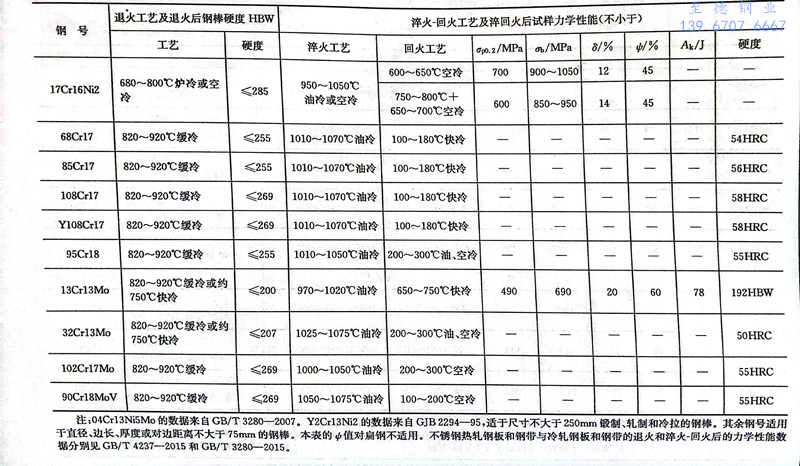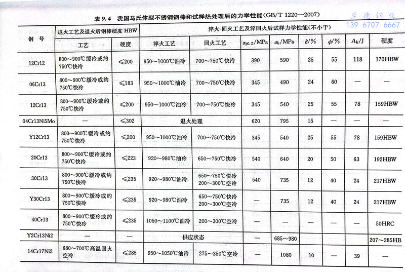 GB/T 1220-2007的Cr13型不銹鋼中不加入其他合金元素的鋼號共有6個,它們之間的主要差別在于碳含量的不同。Cr13型不銹鋼的一個共同特點是加熱和冷卻時具有α→y的轉變,因此可以用熱處理方法在比較寬的范圍內改善它們的力學性能。從顯微組織來劃分,可把06Cr13列為鐵素體鋼(碳含量在上限時,進行少量α→y轉變),12Cr13列為馬氏體-鐵素體鋼(半鐵素體鋼),20Cr13和30Cr13列為馬氏體鋼,40Cr13列為馬氏體-碳化物鋼。這些鋼的主要成分、熱處理工藝及力學性能見表9.2和表9.4。生產實際中以12Cr13、20Cr13、30Cr13、40Cr13四個鋼號應用較多。