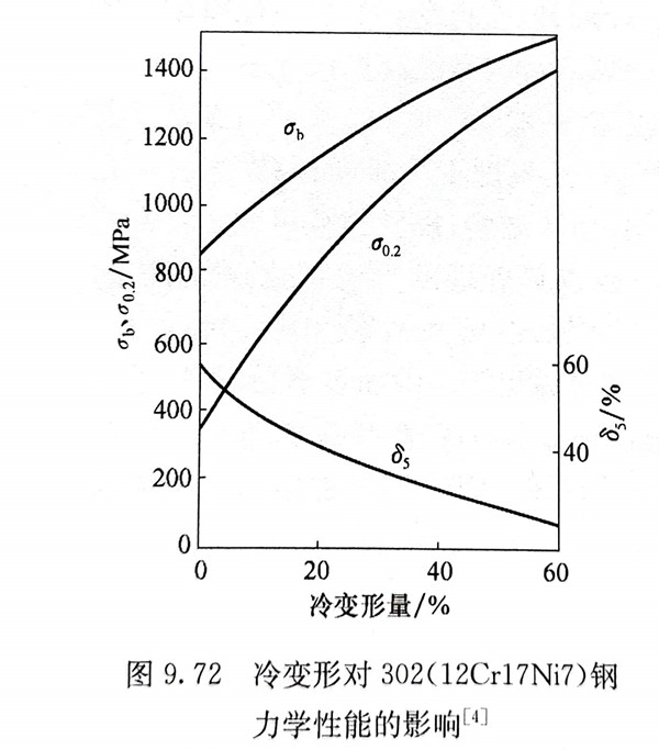 12Cr17Ni7鋼是一種亞穩奧氏體不銹鋼(gang),在固溶狀態具有完全的奧氏體組織,易于冷變形強化。在冷變形過程中,會有一部分轉變為馬氏體,轉變量的大小取決于變形量的大小,從而顯著提高鋼的強度,塑性相應降低(圖9.72)。該鋼固溶態及不同程度冷變形后的力學性能見表9.12及表9.34~表9.38。