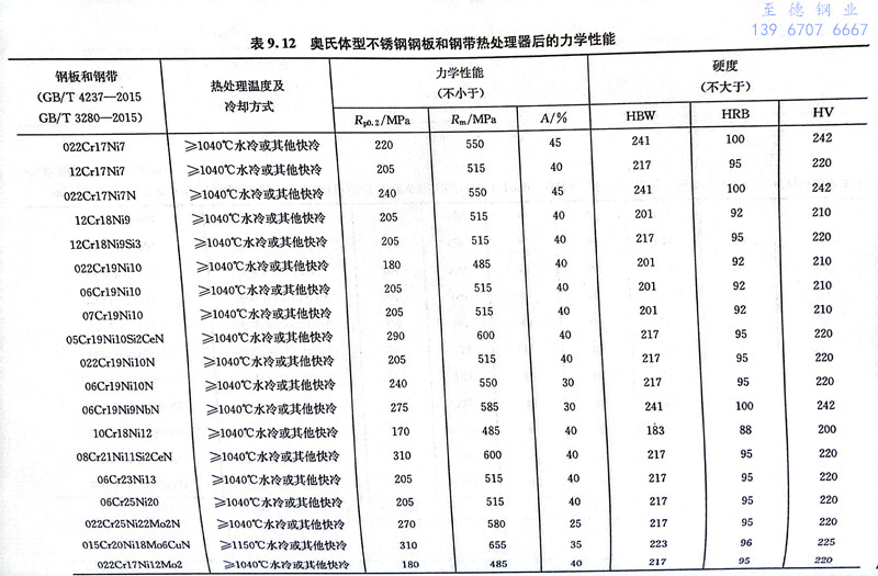 上述三種(zhong)鋼的固溶處(chu)理(li)溫度均為(wei)1010~1150℃,快冷(leng)。12Cr18Ni9Si3和05Cr19Ni10Si2CeN 不銹鋼經固溶處(chu)理(li)后的力(li)學性(xing)能見表9.12。