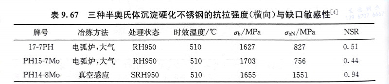 17-7PH和PH15-7Mo鋼具有高的強度并得到較廣泛的應用,但它們存在明顯的缺點,即在σb超過1380MPa時,鋼的缺口敏感性增加,經熱處理后在315~425℃長期使用時產生脆化傾向。表9.67為三種半奧氏體沉淀硬化不銹鋼的抗拉強度與缺口敏感性,這三種鋼經510℃時效后的抗拉強度相近,但其缺口敏感性卻大不相同,17-7PH和PH15-7Mo這兩種鋼的缺口敏感性遠高于PH14-8Mo鋼。當三種鋼處理成具有相同的缺口敏感性時,PH15-7Mo鋼可以利用的強度水平高于17-7PH鋼117MPa鋼,遠低于PH14-8Mo鋼。缺口敏感性這一指標可以直接反映這些鋼在海洋大氣環境條件下的抗應力腐蝕性。