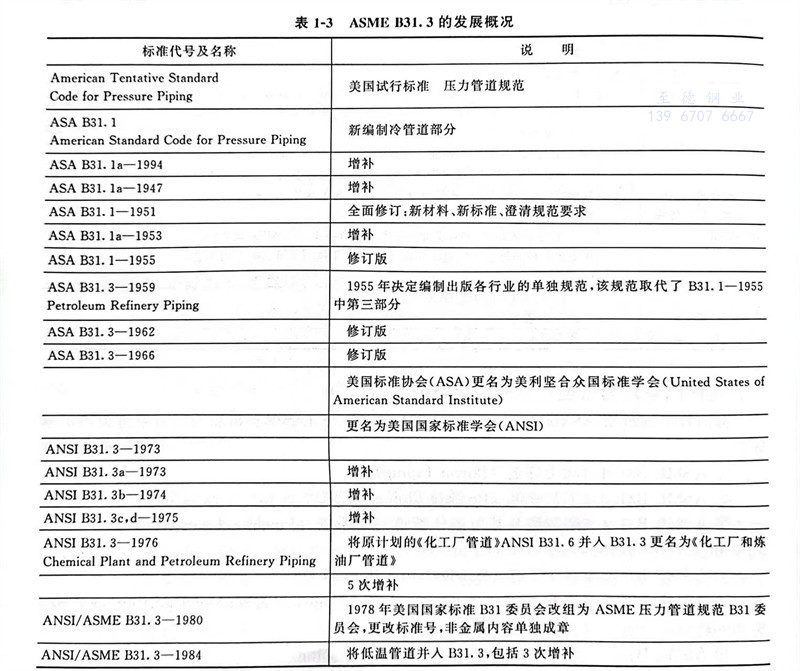 由于1967~1969年(nian)(nian)美(mei)國(guo)(guo)標準(zhun)協會(ASA)先改名為(wei)美(mei)利堅合眾國(guo)(guo)標準(zhun)學會(USAS),后又改名為(wei)美(mei)國(guo)(guo)國(guo)(guo)家標準(zhun)學會(ANSI),故1973年(nian)(nian)標準(zhun)代(dai)號改為(wei)ANSI B31.3。1976年(nian)(nian)因并入了化(hua)工(gong)廠管(guan)(guan)(guan)道內容而更名為(wei)《化(hua)工(gong)廠和煉油廠管(guan)(guan)(guan)道》。1978年(nian)(nian)美(mei)國(guo)(guo)國(guo)(guo)家標準(zhun)B31委員(yuan)(yuan)會改組(zu)為(wei) ASME壓力管(guan)(guan)(guan)道規范(fan)B31委員(yuan)(yuan)會,自1980年(nian)(nian)后各版(ban)標準(zhun)分別以ANSI/ASMEB31.3,ASME/ANSI B31.3和ASME B31.3代(dai)號出(chu)版(ban),1996年(nian)(nian)版(ban)更名為(wei)ASME B31.3《工(gong)藝管(guan)(guan)(guan)道》,一直(zhi)沿(yan)用到現在的最(zui)新(xin)版(ban)ASME B31.3,其發展概(gai)況見(jian)表1-3。