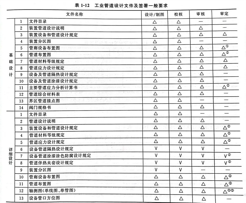 壓力(li)管道(dao)(dao)專業設(she)(she)(she)計(ji)(ji)文件(jian)及(ji)簽(qian)(qian)署要(yao)(yao)求(qiu)(qiu)見國家(jia)和行業標(biao)準(zhun)規定,各設(she)(she)(she)計(ji)(ji)單(dan)位可能不同。根據(ju)規范要(yao)(yao)求(qiu)(qiu),文件(jian)目錄(lu)和管道(dao)(dao)布(bu)置(zhi)圖需要(yao)(yao)蓋(gai)設(she)(she)(she)計(ji)(ji)單(dan)位壓力(li)管道(dao)(dao)印章。工業管道(dao)(dao)設(she)(she)(she)計(ji)(ji)文件(jian)及(ji)簽(qian)(qian)署一(yi)(yi)般要(yao)(yao)求(qiu)(qiu)見表(biao)1-12。筆者考察了(le)國外(wai)一(yi)(yi)些設(she)(she)(she)計(ji)(ji)單(dan)位的(de)壓力(li)管道(dao)(dao)設(she)(she)(she)計(ji)(ji)文件(jian)及(ji)簽(qian)(qian)署要(yao)(yao)求(qiu)(qiu),為了(le)保(bao)證設(she)(she)(she)計(ji)(ji)質量,對壓力(li)管道(dao)(dao)設(she)(she)(she)計(ji)(ji)文件(jian)的(de)深度及(ji)多級簽(qian)(qian)署要(yao)(yao)求(qiu)(qiu)均非常嚴格,例如,有的(de)國外(wai)設(she)(she)(she)計(ji)(ji)單(dan)位要(yao)(yao)求(qiu)(qiu)三維模(mo)型(xing)抽出的(de)重要(yao)(yao)管線軸測圖至(zhi)少4級校審簽(qian)(qian)署。