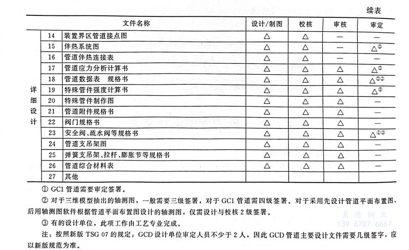 注:按照原(yuan)TSG R1001規(gui)定(ding)(ding)GB1、GB2級管道(dao)主要設(she)計文件需要3級簽署,但是(shi)按照新版TSG 07的規(gui)定(ding)(ding):GB1設(she)計單位審定(ding)(ding)人員不少于2人,因此GB1管道(dao)主要設(she)計文件簽署級別,應以新版規(gui)范為準。