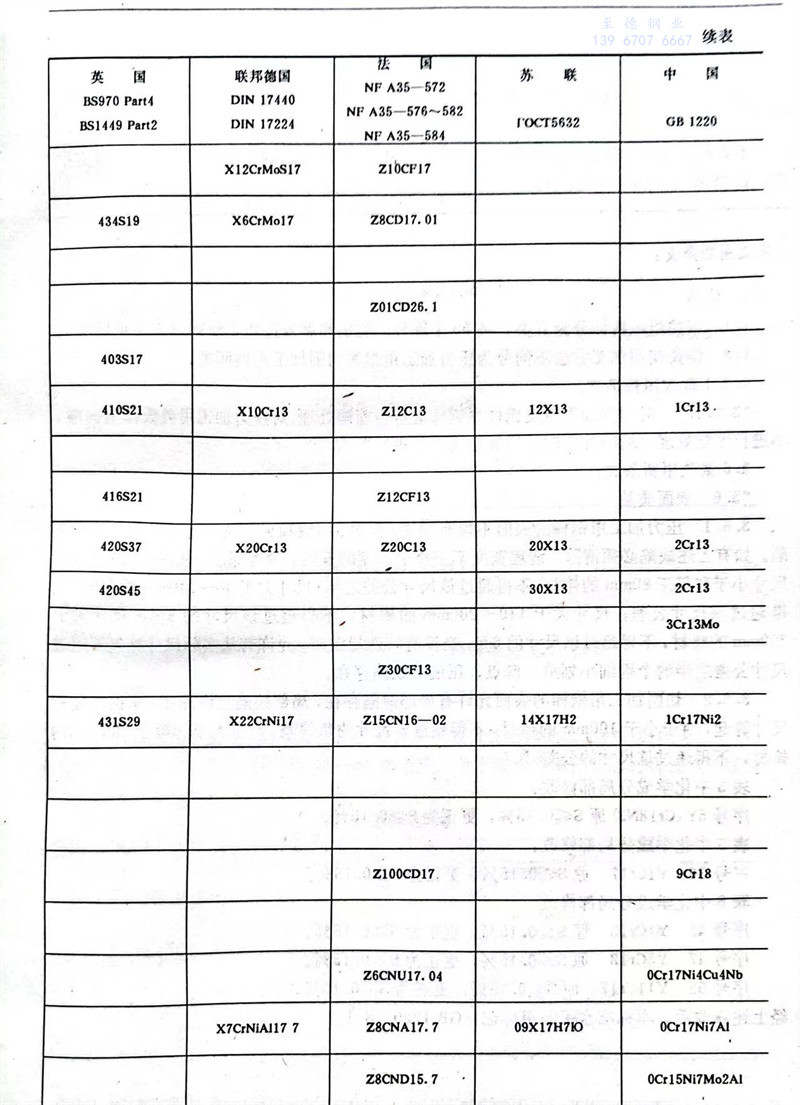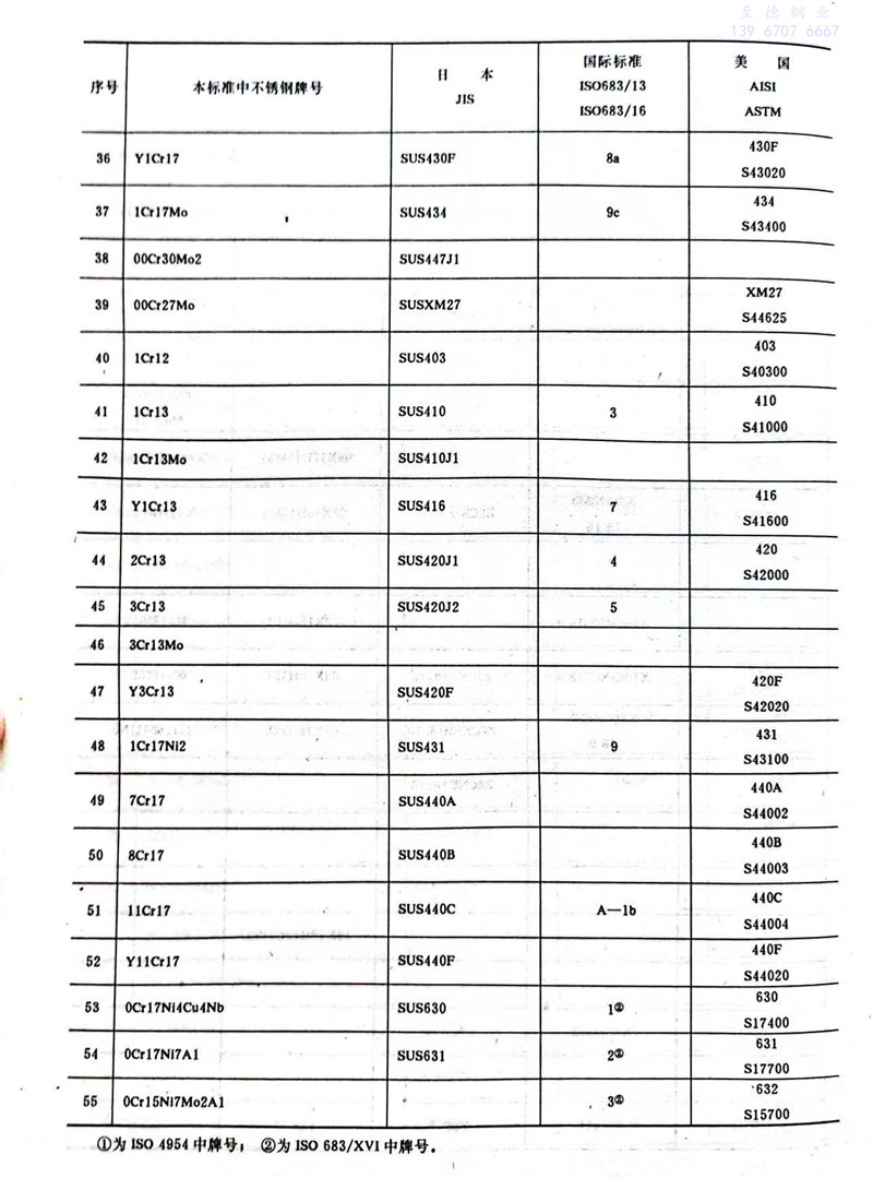 序號43Y1Cr13原S≤0.15%,更正為S≥0.15%。