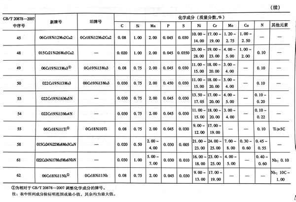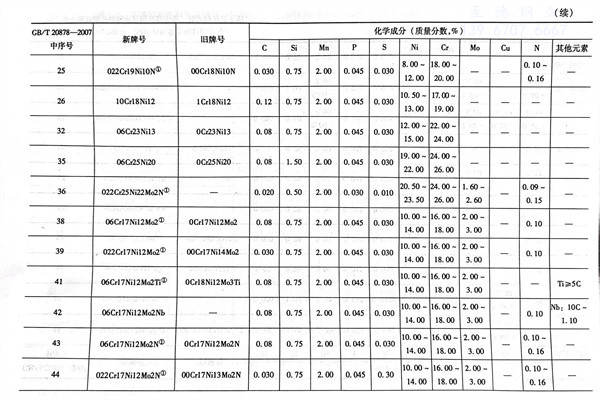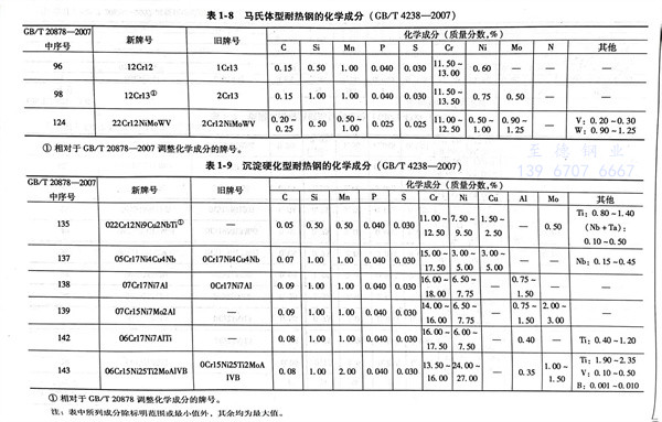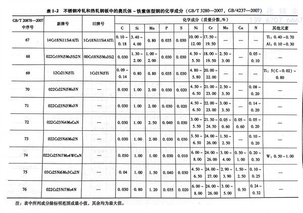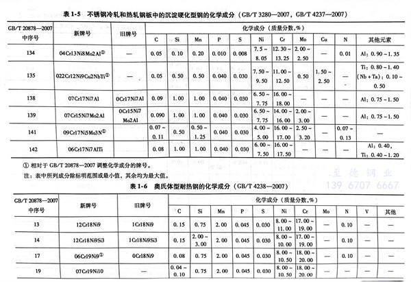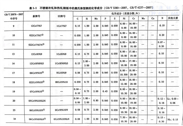 我國國家標準中有不(bu)銹鋼(gang)鋼(gang)板和耐熱鋼鋼板。不銹鋼鋼板又分冷軋(GB/T 3280-2007)鋼板和熱軋(GB/T 4237-2007)鋼板,其牌號和化學成分相同。按金相組織可分為奧氏體型鋼、奧氏體-鐵素體型鋼、鐵素體型鋼、馬氏體型鋼和沉淀硬化型鋼等五種,其化學成分分別見表1-1、表1-2、表1-3、表1-4.和表1-5。耐熱鋼板(GB/T4238-2007)按金相組織可分為奧氏體型鋼、鐵素體型鋼、馬氏體型鋼和沉淀硬化型等四種,其化學成分分別見表1-6、表1-7、表1-8和表1-9。從上述表中進行比較,可以看到奧氏體型耐熱鋼板共有15種牌號,其中10種牌號與奧氏體型不銹鋼板相同;鐵素體型耐熱鋼板共有5種牌號,其中有4種與鐵素體型不銹鋼板相同;馬氏體型耐熱鋼板共有3種牌號,全部在馬氏體型不銹鋼板中;而沉淀硬化型耐熱鋼與沉淀硬化型不銹鋼一樣。綜上所述,不銹鋼和耐熱鋼相互之間的許多牌號是相同的,這些牌號既可作為不銹鋼使用,同時也可作為耐熱鋼使用。本書著重介紹這類牌號的不銹鋼板熔焊方面的知識。