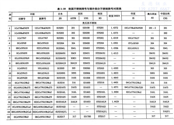 由于我國礦產資源比較豐富,又隨著冶煉技術不斷提高,我國國家標準中不銹(xiu)鋼的種類繁多,與國外部分不銹鋼牌號對照見表1-10。