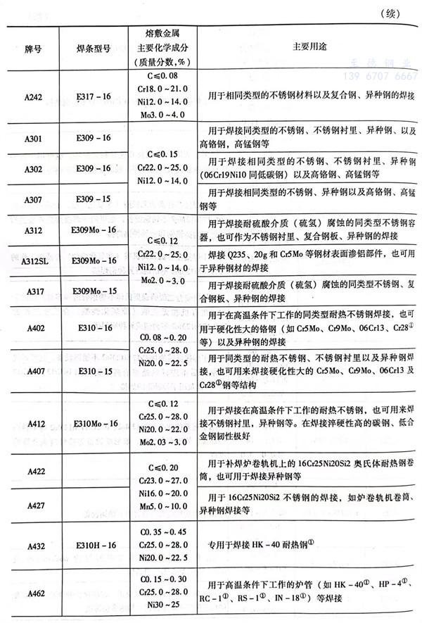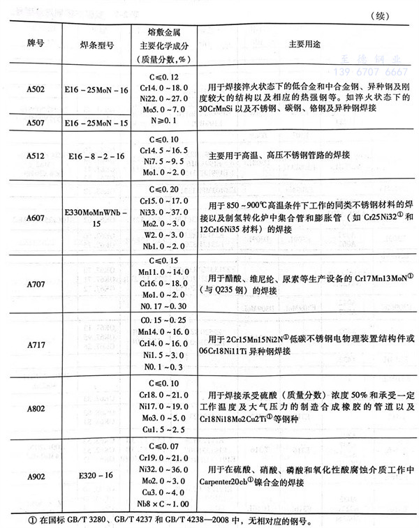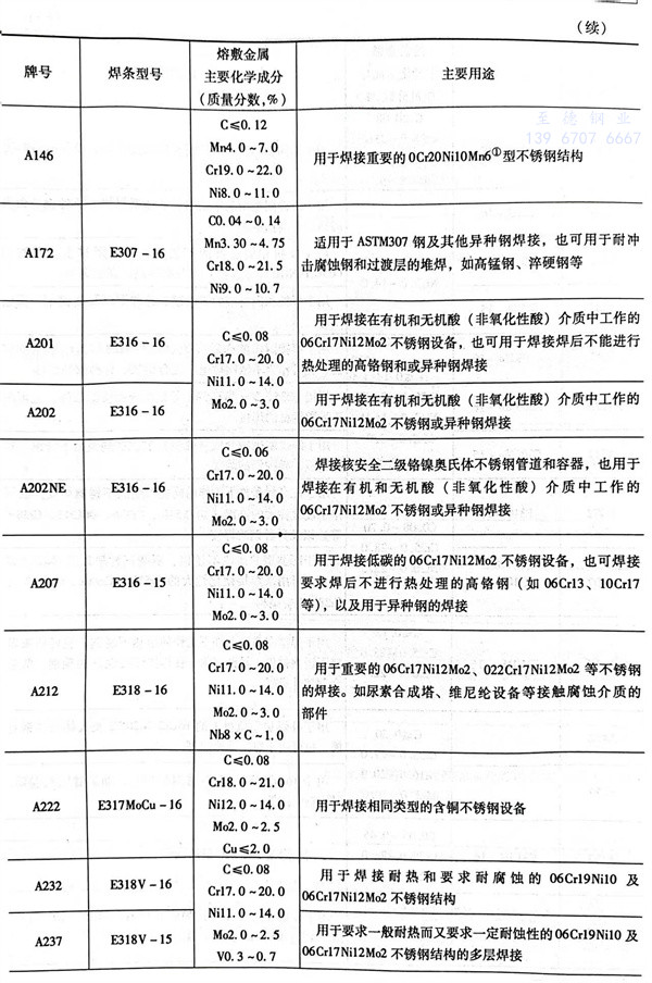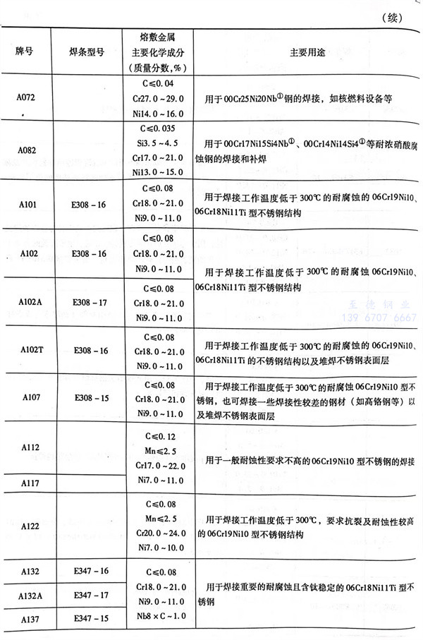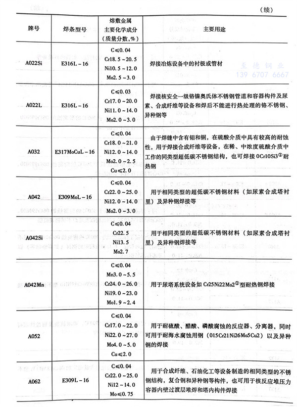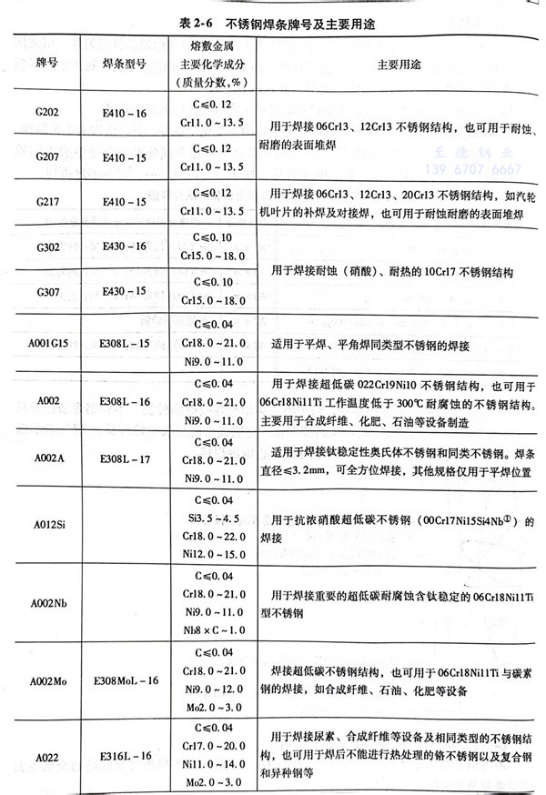 不銹鋼焊條(tiao)牌號(hao)及其(qi)符合或相當于國標GB/T 983-1995焊條(tiao)型號(hao)的(de)熔敷金屬(shu)主要化學成分及主要用途見表2-6。