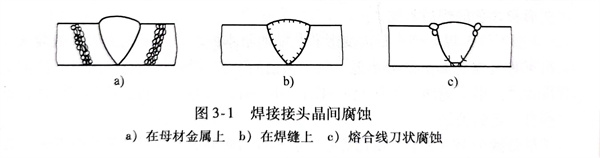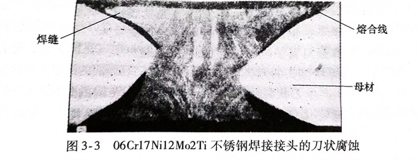 在18-8型不(bu)銹鋼的焊縫金屬中滲入穩定化合金元素鈦、鈮、鋯等,可以消除圖3-1a和圖3-1b兩種形式的晶間(jian)腐蝕,但又可能會出現如圖3-1c中的腐蝕現象,即順著焊縫金屬的熔合線發生像刀切一樣的腐蝕,稱它為刀狀(zhuang)腐蝕。刀狀腐蝕是順著焊縫熔合線向板厚度方向深人,并慢慢地向母材金屬和焊縫金屬發展,如圖3-3所示。刀狀腐蝕將成為制約焊接結構使用壽命的薄弱環節。