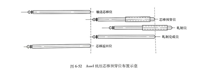 通(tong)過(guo)對連軋(ya)(ya)管(guan)(guan)(guan)機(ji)(ji)組的(de)芯棒(bang)預(yu)(yu)穿(chuan)、循環技術進行(xing)研究(jiu)和借鑒,設計開發了Assel 機(ji)(ji)組芯棒(bang)預(yu)(yu)穿(chuan)和限動小循環技術。圖6-51充分利(li)用(yong)軋(ya)(ya)管(guan)(guan)(guan)機(ji)(ji)前(qian)臺(tai)空(kong)間,芯棒(bang)在(zai)軋(ya)(ya)管(guan)(guan)(guan)機(ji)(ji)前(qian)臺(tai)循環,并設計預(yu)(yu)穿(chuan)線;在(zai)毛(mao)管(guan)(guan)(guan)移(yi)送至(zhi)軋(ya)(ya)管(guan)(guan)(guan)機(ji)(ji)前(qian)臺(tai)后,利(li)用(yong)前(qian)一支毛(mao)管(guan)(guan)(guan)的(de)軋(ya)(ya)制時間,對其進行(xing)預(yu)(yu)先(xian)穿(chuan)棒(bang);待前(qian)一支毛(mao)管(guan)(guan)(guan)軋(ya)(ya)制完(wan)成后,直接由毛(mao)管(guan)(guan)(guan)平移(yi)裝置(zhi)平移(yi)進行(xing)軋(ya)(ya)制。