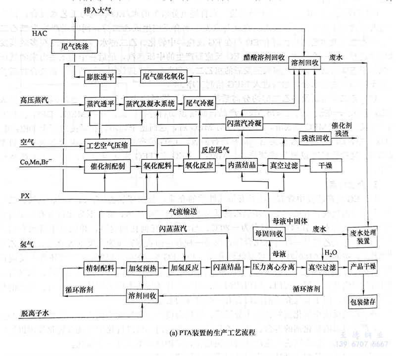 粗對苯二甲酸(suan)生成的(de)核(he)心(xin)部(bu)分(fen)是氧(yang)化(hua)反應(ying)(ying)(ying),即原料對二甲苯、醋酸(suan)溶(rong)(rong)劑(ji)(ji)、主(zhu)催化(hua)劑(ji)(ji)醋酸(suan)鈷和(he)(he)醋酸(suan)錳、副催化(hua)劑(ji)(ji)四(si)溴乙烷(wan)和(he)(he)空氣連續加入氧(yang)化(hua)反應(ying)(ying)(ying)器(qi),通過(guo)反應(ying)(ying)(ying)生成粗對苯二甲酸(suan)(TA)。反應(ying)(ying)(ying)中(zhong)(zhong)放(fang)出(chu)的(de)大量反應(ying)(ying)(ying)熱(re)(re)通過(guo)溶(rong)(rong)劑(ji)(ji)的(de)蒸(zheng)(zheng)發帶走,并通過(guo)副產物(wu)(wu)蒸(zheng)(zheng)汽回收(shou)這部(bu)分(fen)熱(re)(re)量。反應(ying)(ying)(ying)器(qi)頂部(bu)流出(chu)的(de)蒸(zheng)(zheng)發溶(rong)(rong)劑(ji)(ji)送(song)至高壓(ya)吸(xi)(xi)收(shou)塔進(jin)行(xing)(xing)醋酸(suan)蒸(zheng)(zheng)氣吸(xi)(xi)收(shou),然后(hou)送(song)至脫(tuo)水(shui)(shui)塔回收(shou)醋酸(suan)。反應(ying)(ying)(ying)器(qi)下部(bu)出(chu)來(lai)的(de)反應(ying)(ying)(ying)物(wu)(wu)料(TA)、醋酸(suan)、水(shui)(shui)和(he)(he)可能(neng)少量的(de)Br-被送(song)至結(jie)晶(jing)(jing)(jing)(jing)器(qi)進(jin)行(xing)(xing)脫(tuo)水(shui)(shui)和(he)(he)結(jie)晶(jing)(jing)(jing)(jing)。從氧(yang)化(hua)反應(ying)(ying)(ying)器(qi)過(guo)來(lai)的(de)反應(ying)(ying)(ying)物(wu)(wu)料被送(song)至數個串聯的(de)結(jie)晶(jing)(jing)(jing)(jing)器(qi),逐(zhu)次進(jin)行(xing)(xing)降(jiang)溫、降(jiang)壓(ya)和(he)(he)干燥(zao)、結(jie)晶(jing)(jing)(jing)(jing)。從結(jie)晶(jing)(jing)(jing)(jing)器(qi)頂部(bu)蒸(zheng)(zheng)發出(chu)來(lai)的(de)醋酸(suan)蒸(zheng)(zheng)氣分(fen)別被送(song)入高壓(ya)吸(xi)(xi)收(shou)塔或脫(tuo)水(shui)(shui)塔進(jin)行(xing)(xing)醋酸(suan)回收(shou)。底(di)部(bu)出(chu)來(lai)的(de)漿液再經離心(xin)分(fen)離、過(guo)濾送(song)入干燥(zao)機進(jin)行(xing)(xing)干燥(zao),得到粉末狀的(de)中(zhong)(zhong)間產品粗對苯二甲酸(suan)(TA)。
