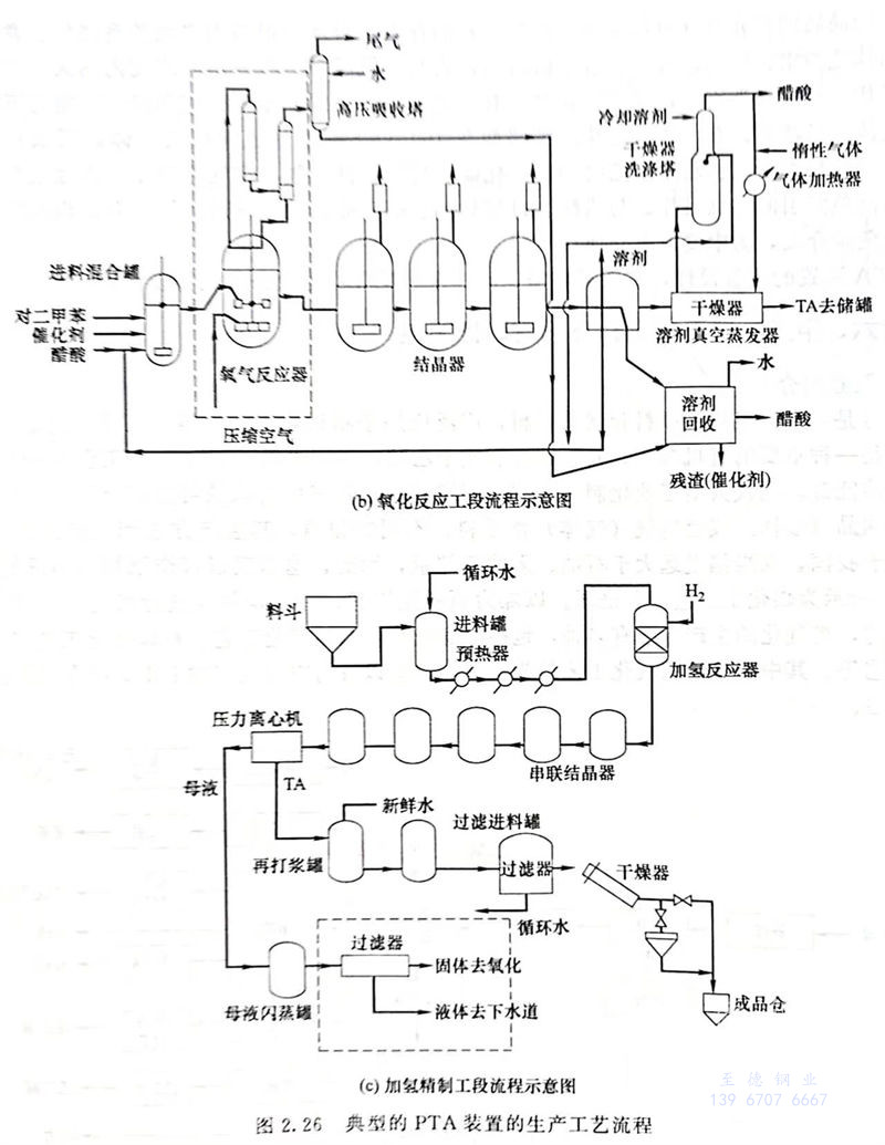 目前世(shi)界上(shang)普遍(bian)采(cai)用對二甲苯(PX)空氣(qi)氧化(hua)法工(gong)藝(yi)。該工(gong)藝(yi)一般由粗(cu)對苯二甲酸(suan)的氧化(hua)生成(cheng)和(he)對苯二甲酸(suan)的加氫(qing)精(jing)制兩(liang)部分組成(cheng),其中(zhong),粗(cu)對苯二甲酸(suan)的氧化(hua)生成(cheng)又包(bao)括(kuo)氧化(hua)、分離干燥和(he)醋酸(suan)回收三個系(xi)統。對苯二甲酸(suan)的加氫(qing)精(jing)制又包(bao)括(kuo)加氫(qing)精(jing)制和(he)分離干燥兩(liang)個系(xi)統。典(dian)型(xing)的PTA裝置(zhi)的生產工(gong)藝(yi)流程如圖(tu)2.26所示(shi)。