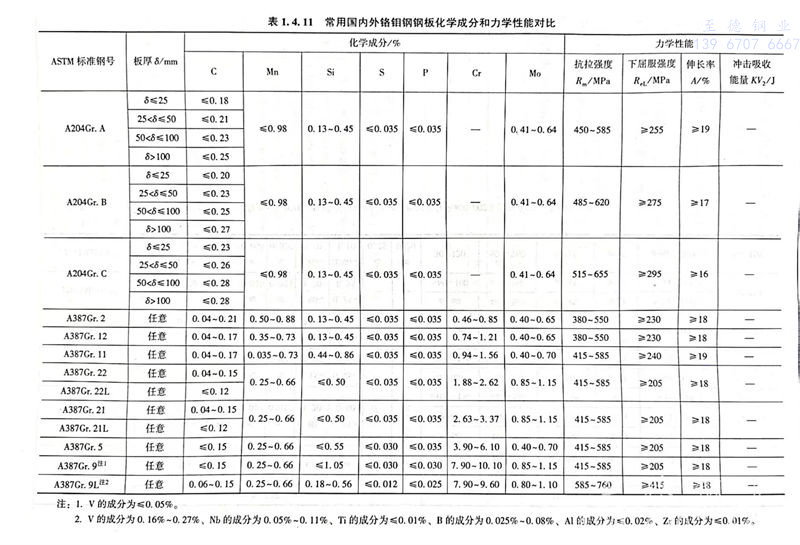 常用國內外鉻鉬(mu)鋼(gang)鋼(gang)板(ban)化學(xue)成分(fen)和力學(xue)性能(neng)對比見表1.4.11。