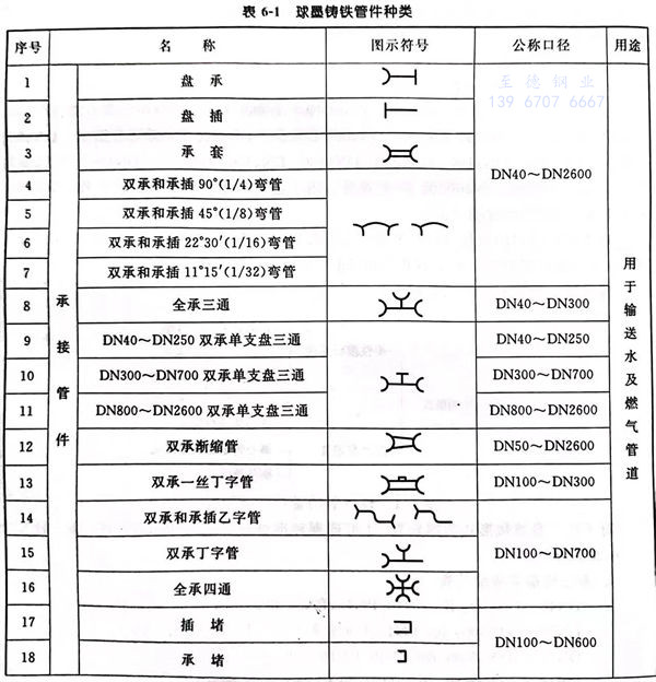 球墨鑄(zhu)鐵(tie)管(guan)件的(de)分(fen)類由各種接口形式派生而得。球墨鑄(zhu)鐵(tie)管(guan)件的(de)種類見表6-1。