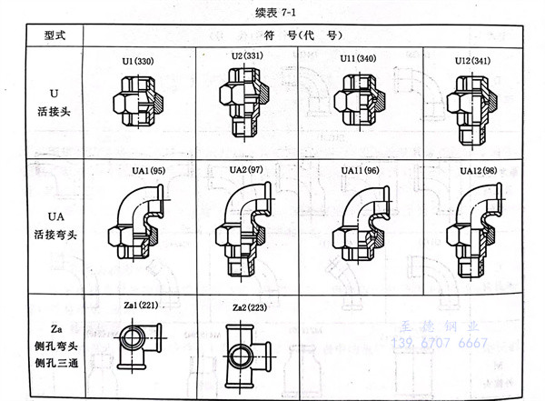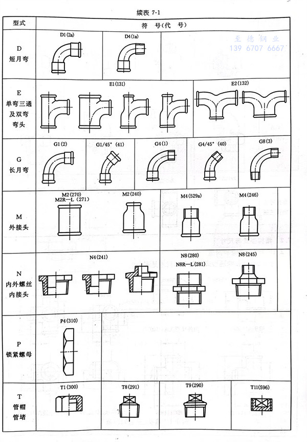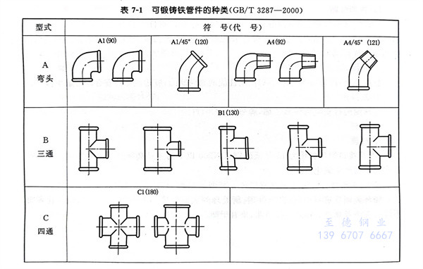 按結構型式(shi)劃(hua)分的可鍛鑄鐵管(guan)(guan)件種(zhong)類見表7-1。表中(zhong)的規定符號(hao)(代號(hao))與管(guan)(guan)路(lu)識(shi)別有關,可以用于標記。