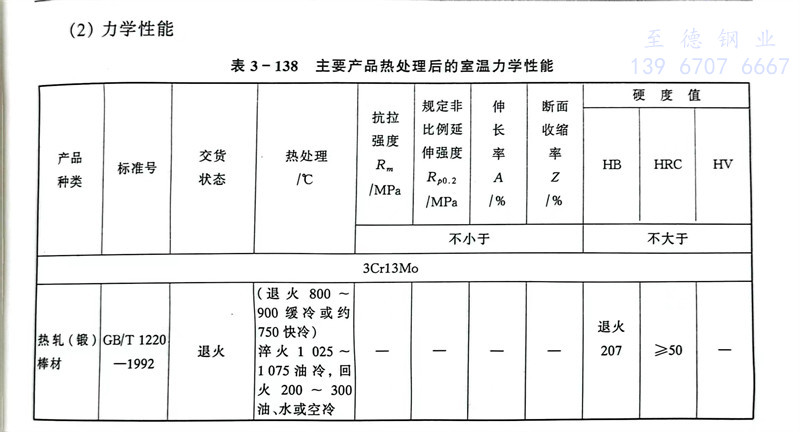 主要性能與3Cr13不銹鋼相同。但因含有0.50%~1.00%鉬,可提高鋼的耐蝕性,其耐蝕性比3Cr13不銹鋼和4Cr13不(bu)銹鋼好。3Cr13Mo不銹鋼經淬火并回火熱處理后,在腐蝕介質中具有承受高機械載荷能力和耐磨性能。但可焊性能差。