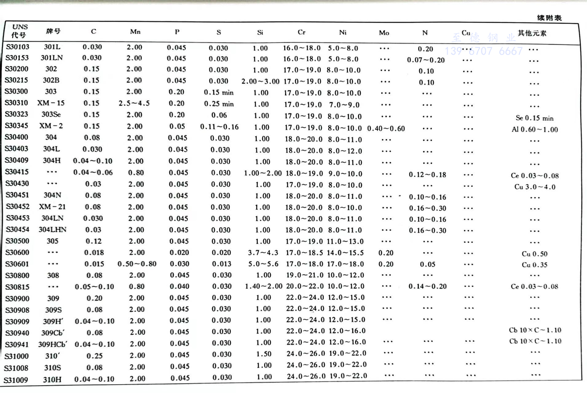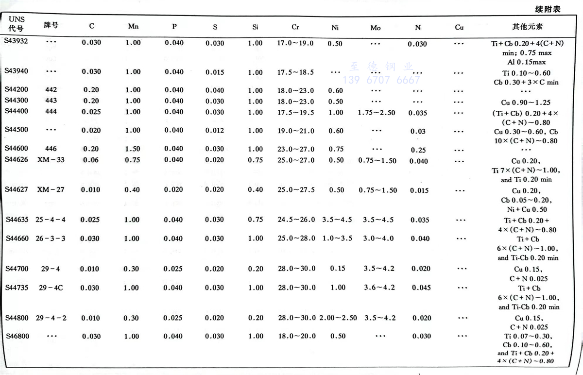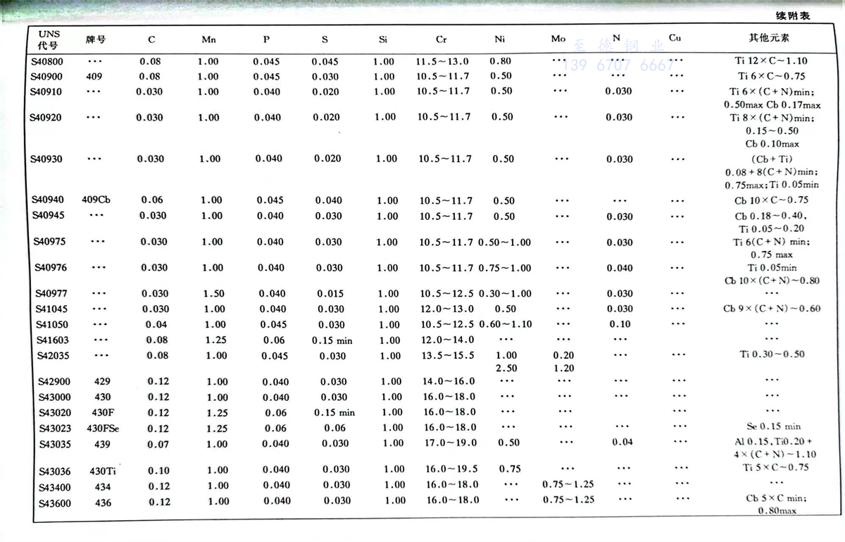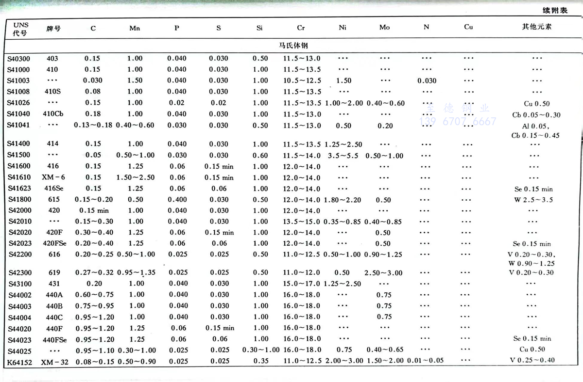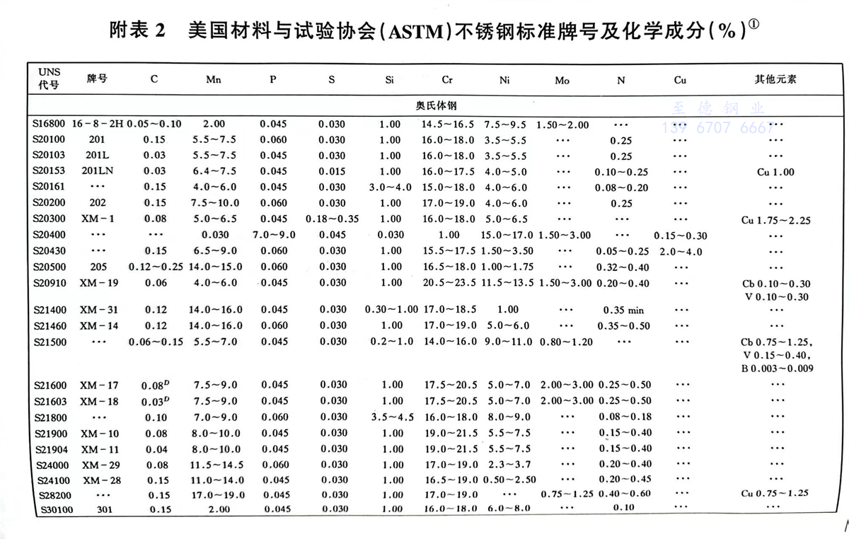 美(mei)國材料(liao)與試驗(yan)協會(ASTM)不銹(xiu)鋼標準牌號(hao)及(ji)化學成分(%)