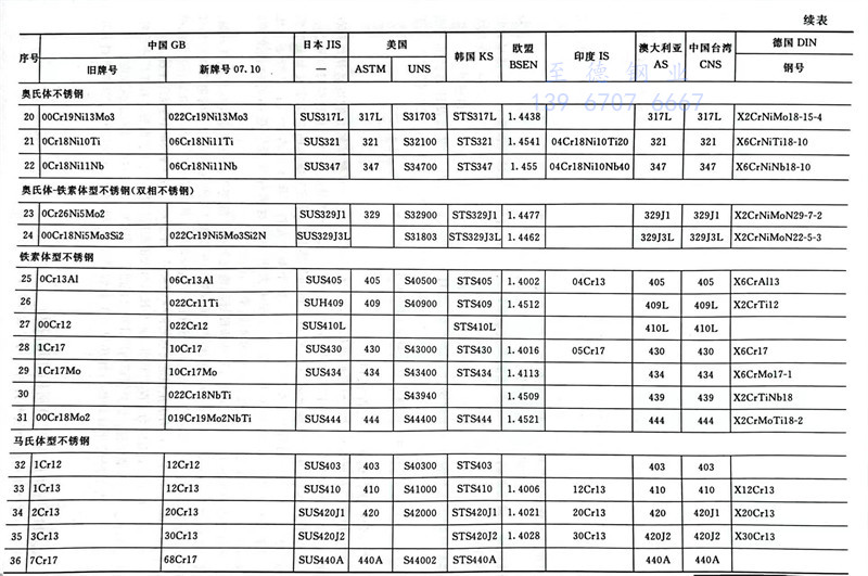 由于GB/T 20878-2007《不銹鋼和耐熱鋼 牌號及化學成分》修改了不銹鋼和耐熱鋼的牌號,有一些國內標準規范更新了,有的仍在沿用以前的牌號,因此浙江至德鋼業有限公司列出了不銹鋼新舊牌號與其他種類牌號的對比,見表4-16。