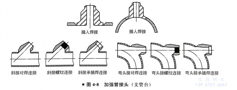 圖4-8所示(shi)的(de)(de)插入(ru)加強(qiang)管(guan)(guan)(guan)接(jie)(jie)(jie)頭、斜接(jie)(jie)(jie)加強(qiang)管(guan)(guan)(guan)接(jie)(jie)(jie)頭、彎頭加強(qiang)管(guan)(guan)(guan)接(jie)(jie)(jie)頭以及Sweepolet加強(qiang)管(guan)(guan)(guan)接(jie)(jie)(jie)頭與主(zhu)管(guan)(guan)(guan)連接(jie)(jie)(jie)的(de)(de)焊(han)縫(feng)可(ke)進(jin)行無(wu)損探傷檢查,焊(han)接(jie)(jie)(jie)可(ke)靠,克服了“馬鞍焊(han)”的(de)(de)角焊(han)縫(feng)質量不宜(yi)保證、檢查困難的(de)(de)缺點,適用(yong)于(yu)火(huo)災(zai)危險分類為甲(jia)、乙類介質和(he)劇毒介質的(de)(de)管(guan)(guan)(guan)道,是理想的(de)(de)管(guan)(guan)(guan)接(jie)(jie)(jie)頭。目前,國內還(huan)沒有制(zhi)造(zao)廠生(sheng)產這幾種接(jie)(jie)(jie)頭。圖4-9所示(shi)是承插焊(han)與螺紋連接(jie)(jie)(jie)的(de)(de)變(bian)徑管(guan)(guan)(guan)接(jie)(jie)(jie)頭,用(yong)于(yu)DN50以下管(guan)(guan)(guan)道及其管(guan)(guan)(guan)配件的(de)(de)連接(jie)(jie)(jie)。