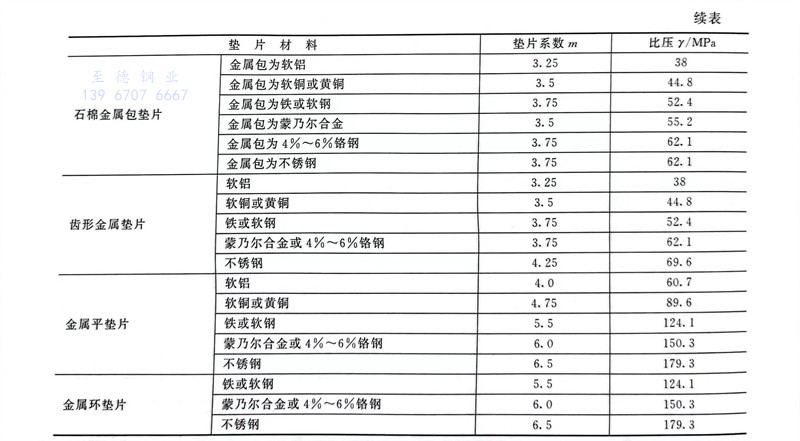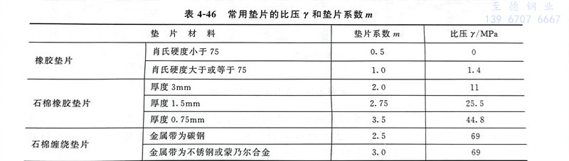 非(fei)金屬和(he)半金屬墊(dian)(dian)片(pian)(pian)的應力松弛(chi)率按(an)《管法(fa)(fa)蘭(lan)墊(dian)(dian)片(pian)(pian)應力松弛(chi)試驗(yan)方(fang)法(fa)(fa)》(GB/T 12621)測得(de)。這兩(liang)類墊(dian)(dian)片(pian)(pian)的壓(ya)縮率和(he)回(hui)彈率按(an)《管法(fa)(fa)蘭(lan)墊(dian)(dian)片(pian)(pian)壓(ya)縮率及回(hui)彈率試驗(yan)方(fang)法(fa)(fa)》(GB/T12622)測定。此外,國(guo)標還規定了纏(chan)繞墊(dian)(dian)的試驗(yan)方(fang)法(fa)(fa),見GB/T 14180。常用墊(dian)(dian)片(pian)(pian)的比壓(ya)γ和(he)墊(dian)(dian)片(pian)(pian)系數m見表4-46。