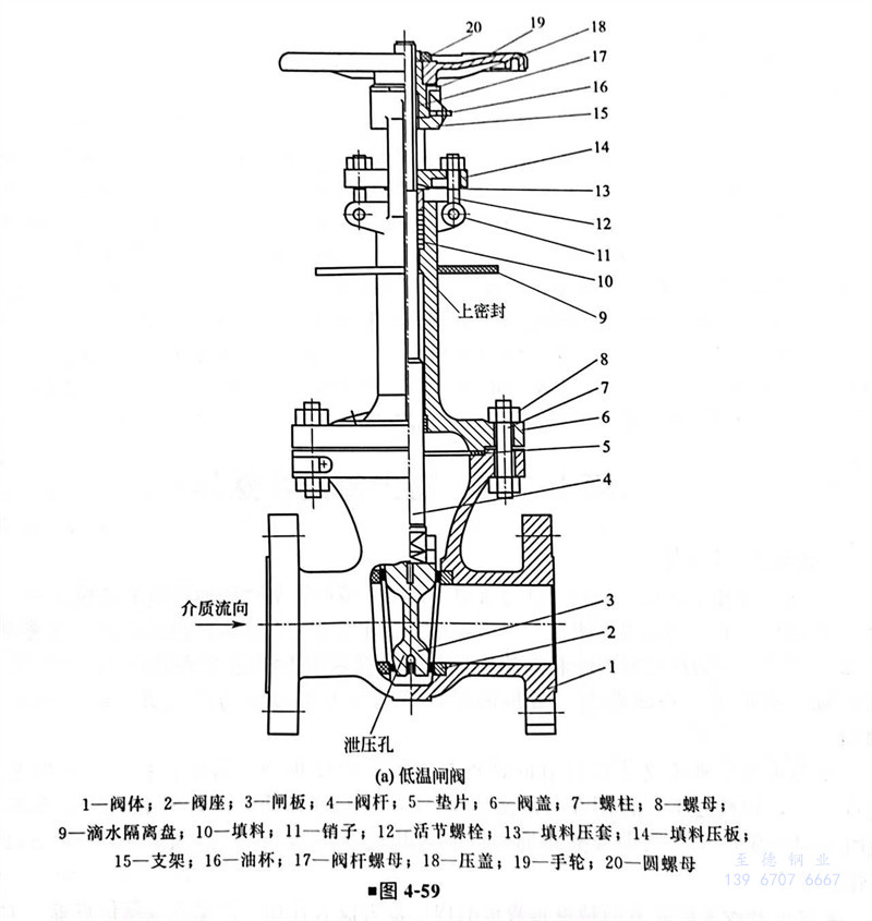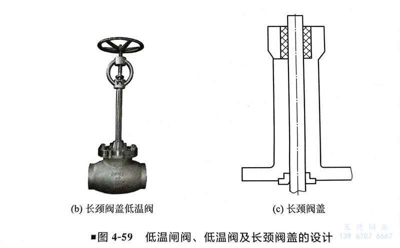 奧(ao)氏體不銹耐酸鋼制造(zao),經熱處(chu)理(li)(li),以提高抗(kang)拉強度(du),鍍硬鉻(鍍層厚度(du)0.04~0.06mm),或(huo)進行滲氮處(chu)理(li)(li),以提高表面硬度(du)。介質溫度(du)的(de)降(jiang)低(di)容易在填料(liao)函處(chu)產生泄(xie)漏和結冰,閥門閥蓋長頸結構,填料(liao)避開低(di)溫區,提高填料(liao)的(de)使用性能和使用壽命,見圖4-59。