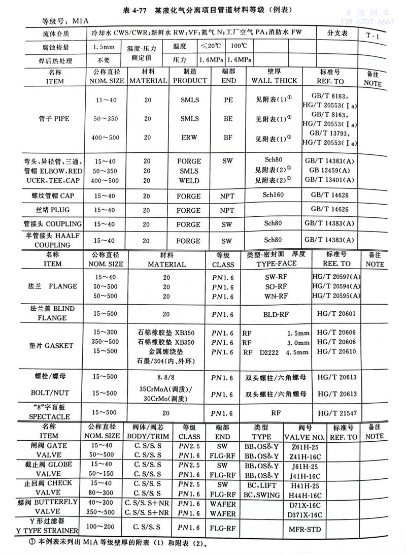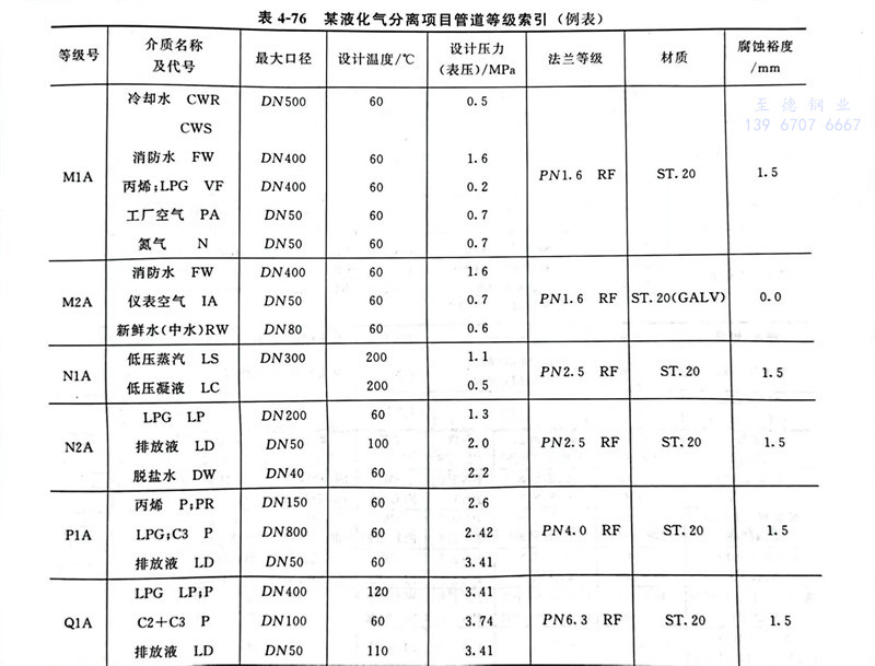 管(guan)道等級(ji)索引(yin)表的(de)基本內容和(he)格式見表4-76。管(guan)道材料(liao)等級(ji)表見表4-77。