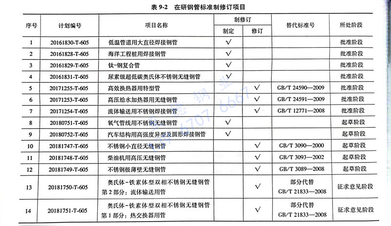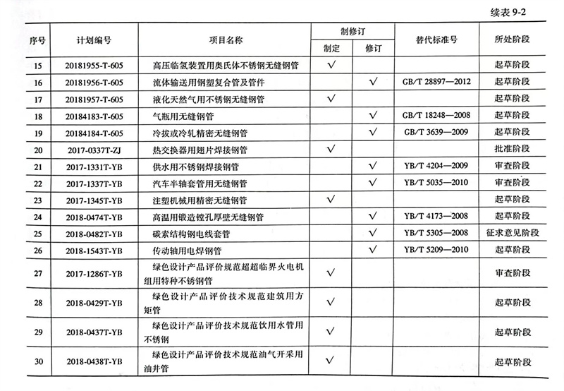 浙江至德鋼業有限公司是專業不(bu)銹鋼管(guan)生(sheng)產廠(chang)家,通過公司技術人員得知,截至2018年底,按照國家標準化管理委員會、工業和信息化部分別下達的國家、行業標準制修訂計劃,在研不銹鋼(gang)管標準項目計劃30項,其中國家標準19項,行業標準項目11項;制定項目14項,修訂項目16項。在研計劃項目見表9-2。從表9-2看出,在研項目主要集中在鍋爐、石化、軌道交通、石油、建筑、海洋工程、機械、汽車等領域。
