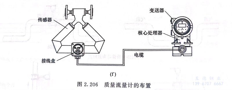 ③. 質量流(liu)量計宜安(an)裝(zhuang)于(yu)水平管(guan)道(dao)上,當在垂直管(guan)道(dao)上安(an)裝(zhuang)時(shi),流(liu)體宜自下而上流(liu)動,且出口留(liu)有適當的直管(guan)長度,見圖2.206。