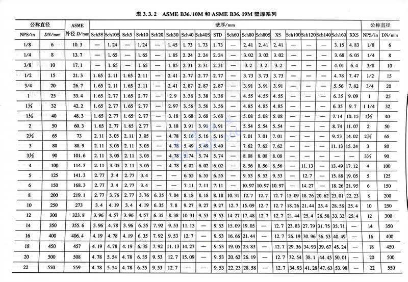 ASME B36.10M《焊接和無縫軋制鋼管》和ASME B36.19M《不銹鋼管(guan)道(dao)》壁厚系列見表3.3.2。