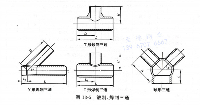 a. 引進(jin)型(xing)600MW機組(zu)鍛制、焊制三通(tong)結(jie)構(gou)型(xing)式見(jian)圖13-5,尺寸見(jian)表13-10;引進(jin)型(xing)300MW 機組(zu)鍛制、焊制三通(tong)結(jie)構(gou)型(xing)式見(jian)圖13-5,尺寸見(jian)表13-11;