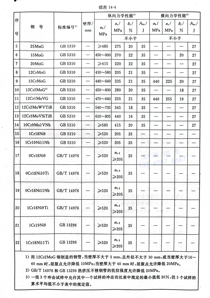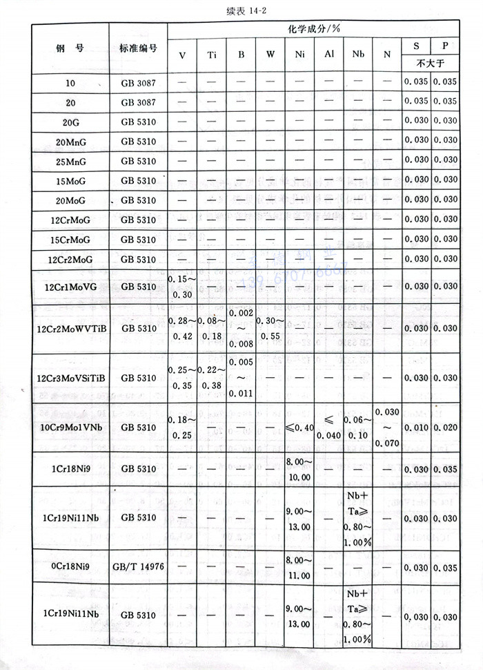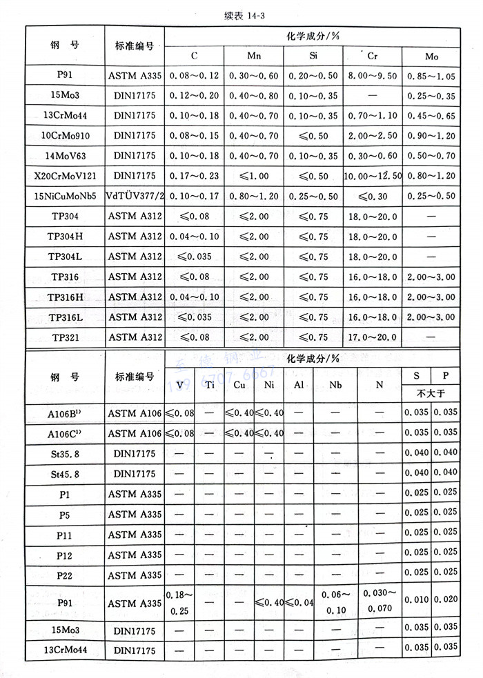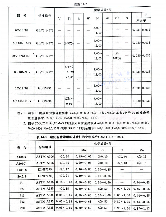 不(bu)銹鋼管材(cai)料(liao)應(ying)(ying)按質(zhi)量合(he)(he)格證(zheng)書(shu)或質(zhi)量保證(zheng)書(shu)進(jin)行質(zhi)量驗收。質(zhi)量合(he)(he)格證(zheng)書(shu)或質(zhi)量保證(zheng)書(shu)應(ying)(ying)標明鋼號(hao)、化(hua)學(xue)(xue)成(cheng)分、力學(xue)(xue)性能(常用(yong)管材(cai)化(hua)學(xue)(xue)成(cheng)分及分學(xue)(xue)性能見表14-2~表14-5),以及必要(yao)的(de)(de)熱處理(li)工藝等。數據不(bu)全(quan)的(de)(de)應(ying)(ying)進(jin)行補檢(jian),補檢(jian)的(de)(de)方法、范圍、數量應(ying)(ying)符合(he)(he)國家(jia)標準或行業標準。進(jin)口鋼管除應(ying)(ying)符合(he)(he)合(he)(he)同規定的(de)(de)有(you)關國家(jia)的(de)(de)技術標準外,還應(ying)(ying)有(you)入境貨物(wu)檢(jian)驗檢(jian)疫證(zheng)明。