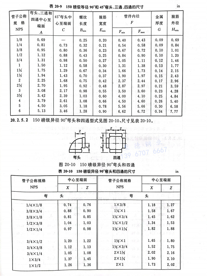 150磅級等徑90°和(he)(he)45°彎頭、三通和(he)(he)四通型式見圖20-9,尺寸見表20-9。