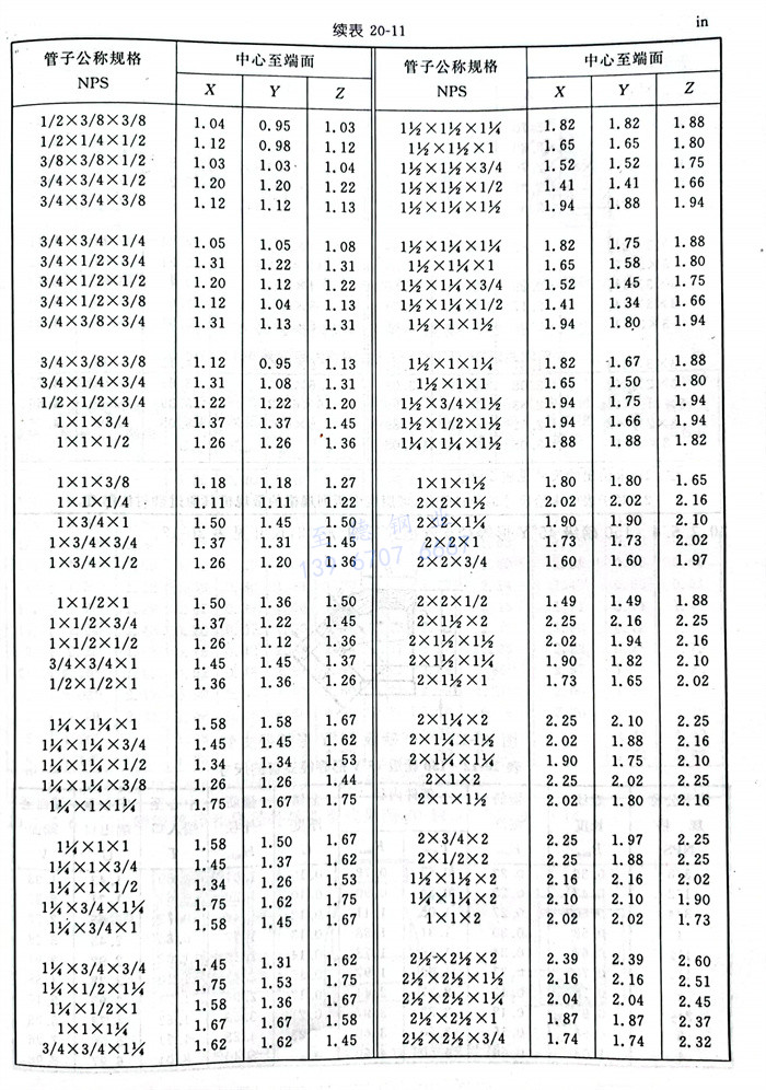 管件(jian)中心至端面的(de)(de)尺寸(cun)允許公(gong)(gong)差見表20-25(檢(jian)驗公(gong)(gong)差)。端面至端面的(de)(de)尺寸(cun)公(gong)(gong)差及接頭和異徑(jing)(jing)接頭的(de)(de)長度(du)公(gong)(gong)差應(ying)為表20-25中所列值的(de)(de)兩倍。控制(zhi)異徑(jing)(jing)管件(jian)最(zui)大開(kai)孔尺寸(cun)的(de)(de)公(gong)(gong)差應(ying)適用(yong)于(yu)所有開(kai)孔。這些公(gong)(gong)差不適用(yong)于(yu)180°彎頭和管帽(mao)。