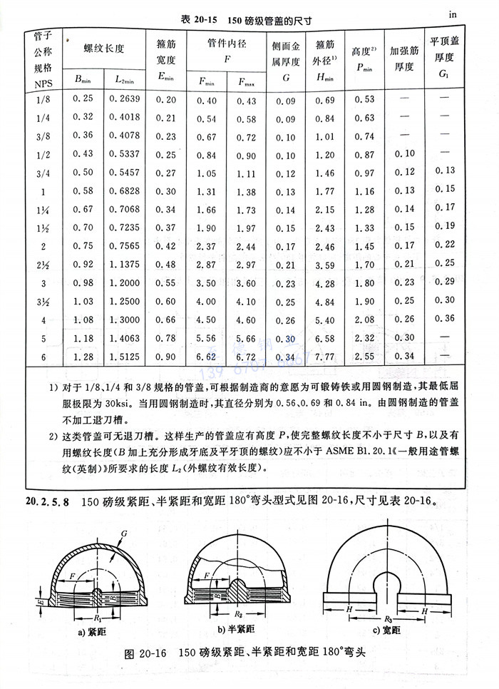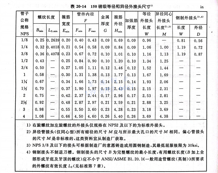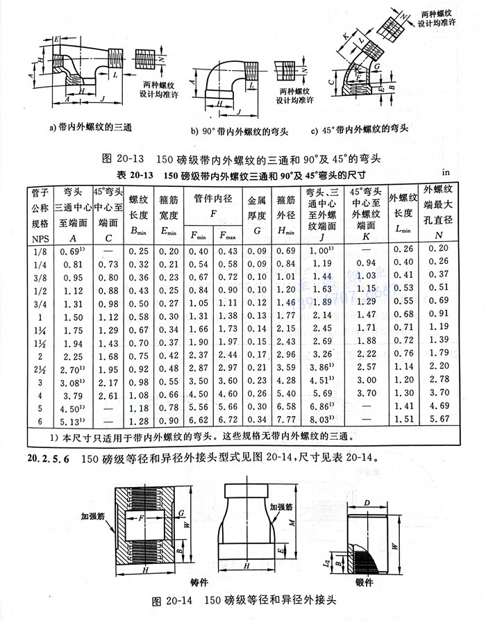 所(suo)(suo)有(you)管件(jian)均應(ying)(ying)按ASME B1.20.1《一般用途的英制管螺紋》加工螺紋,除NPS 1/8、NPS 1/4和NPS 3/8規格的鍛軋(ya)接頭(表20-14)和管蓋(表20-15)可用圓柱管螺紋外,其他(ta)所(suo)(suo)有(you)管件(jian)均應(ying)(ying)為(wei)錐(zhui)管螺紋。